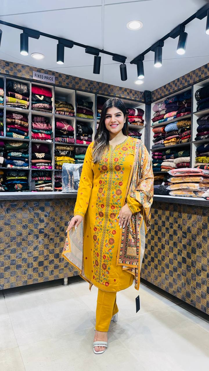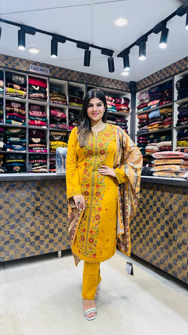 Mahvish is a Mustard Yellow Premium Knitted 3-piece set, enriched with vibrant multicolour floral embroidery running down the neckline, sleeves, and center panel. The detailing blends warm tones of red, green, and orange, giving the outfit a bright yet composed traditional look.