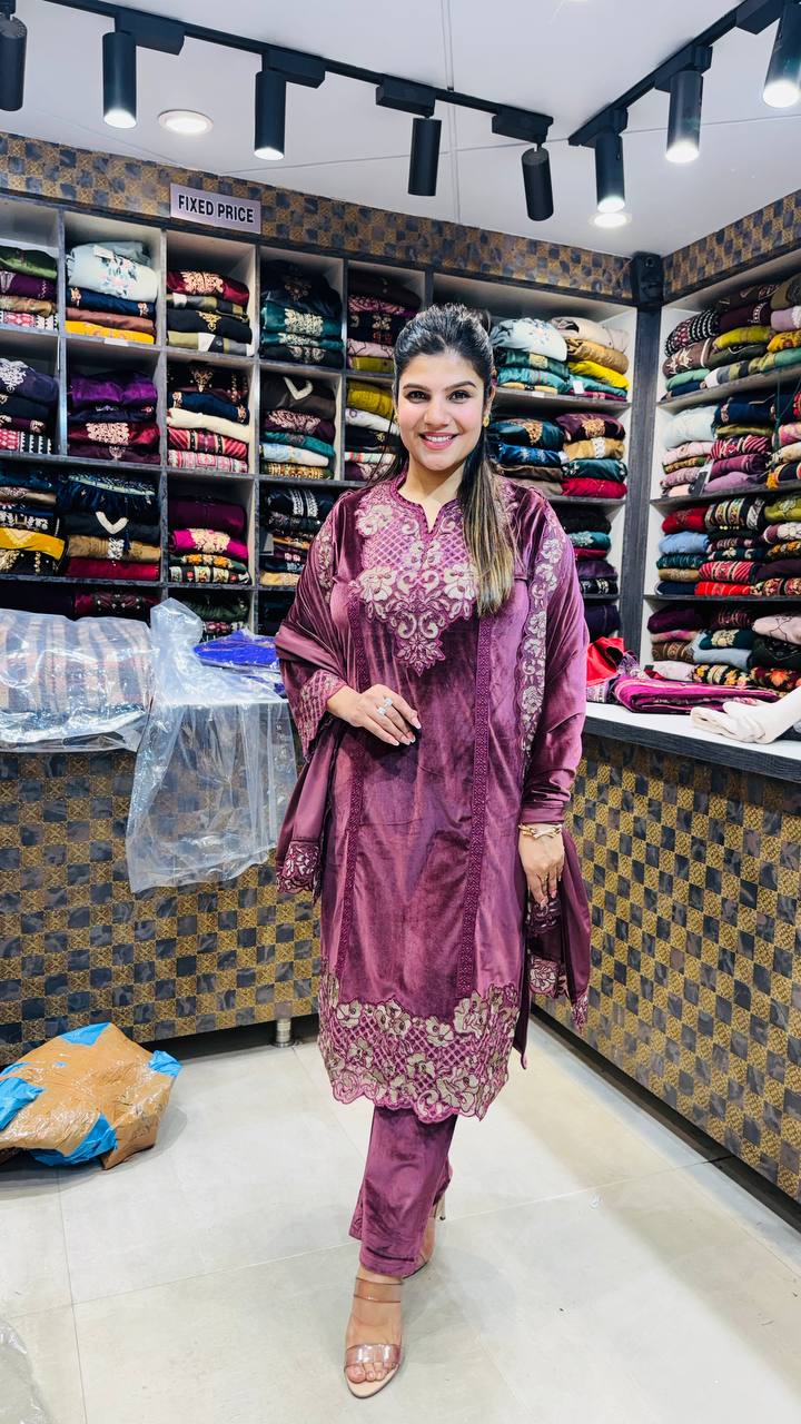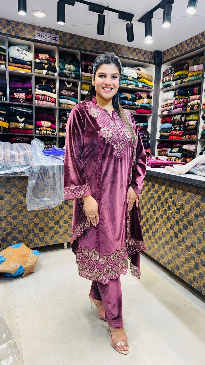 Marvella is a Premium Velvet 3-Piece ensemble crafted in a rich dusty plum-rose tone, designed to feel opulent yet composed. The shirt features ornate antique-gold embroidery concentrated along the neckline, borders, and cuffs, creating a graceful contrast against the deep velvet base.