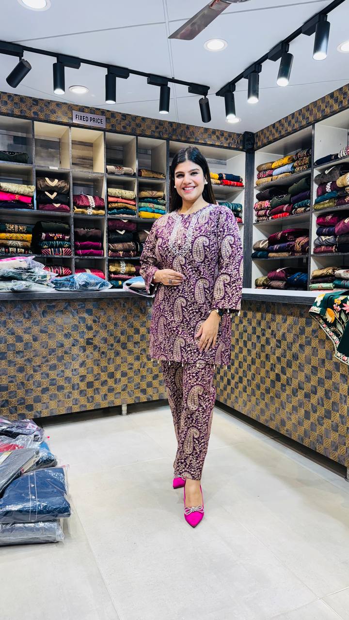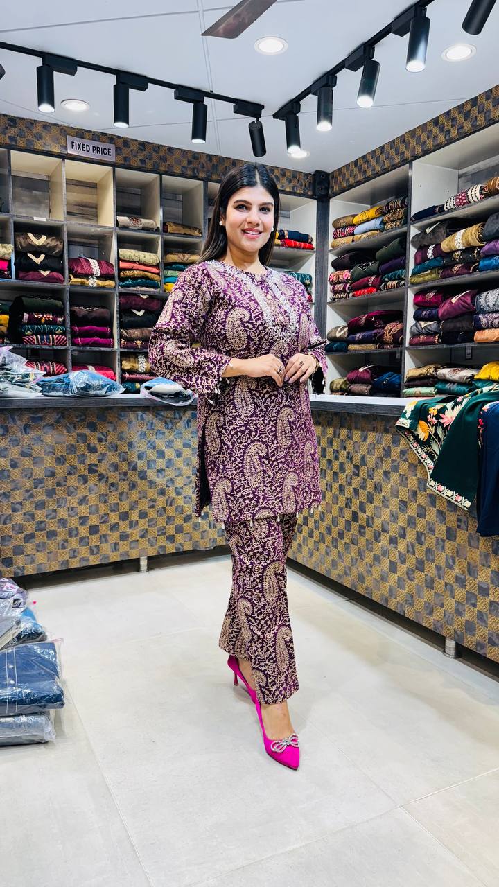 Dipped in soft premium cotrize fabric, this mauve-toned ensemble radiates timeless elegance. The outfit features an intricate paisley pattern in antique golden threadwork that adds a luxurious texture and depth to the design. The straight-cut kurta, paired with matching pants, offers both comfort and sophistication. Detailed sleeve finishes with subtle embellishments complete the regal look — perfect for festive soirées and elegant day events.