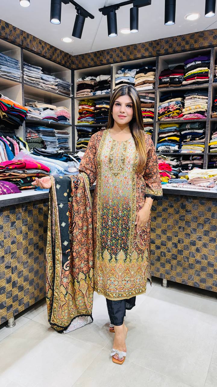 ✨ Design: Ornamental Front Panel Detailing • Printed Dupatta with Traditional Motifs • Elegant Straight Black Bottom