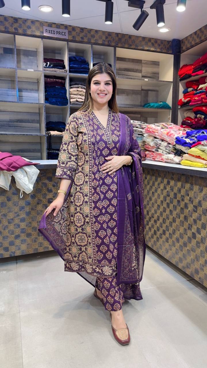 A stunning premium cotton suit in a rich royal purple shade, detailed with intricate beige-gold traditional motifs all over. The straight-cut kurta features elegant block-style patterns with a finely designed neckline and heavily bordered hem. Paired with matching printed pants and a beautifully coordinated dupatta, this outfit reflects timeless ethnic charm with everyday comfort. Perfect for festive gatherings, family functions, or graceful day wear.