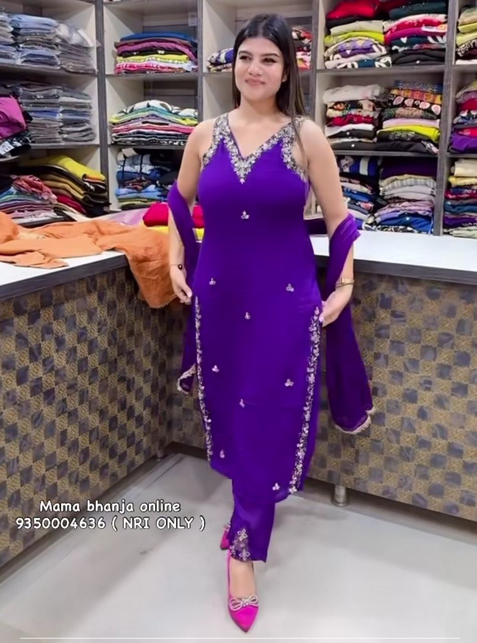 Mehzabeen embodies royal charm with its deep violet hue and delicate zari embroidery that graces the neckline, borders, and hemline. Crafted from premium Chinon fabric, this 3-piece suit offers a graceful drape with a subtle sheen, enhancing its luxurious appeal. The matching dupatta and pants complete the look β perfect for festive evenings or elegant gatherings.
