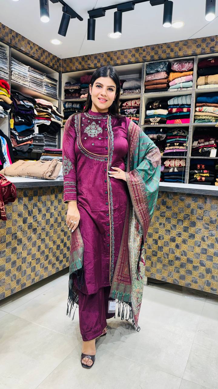 Merlina is a deep Plum Purple 3-piece suit crafted in premium soft Cotrize fabric with a velvety winter sheen. The shirt features intricate teal and antique-gold threadwork on the neckline, front panel, and sleeves, creating a rich traditional aesthetic.