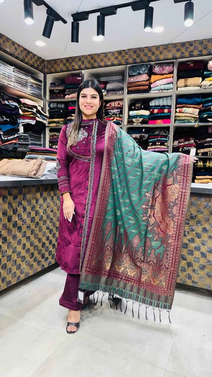 The digital woven shawl-style dupatta adds multi-tone elegance in green, maroon, and gold patterns, giving the outfit a luxurious winter vibe. Paired with matching cotrize trousers for a complete polished look.