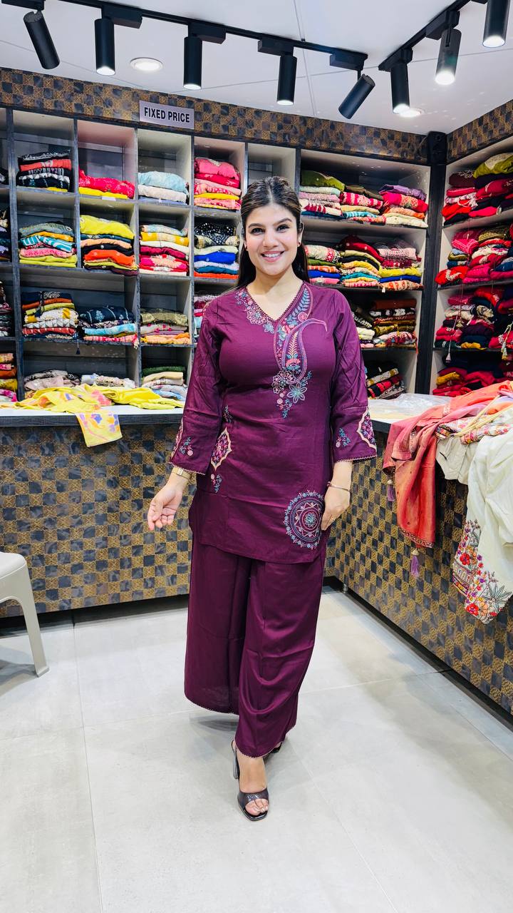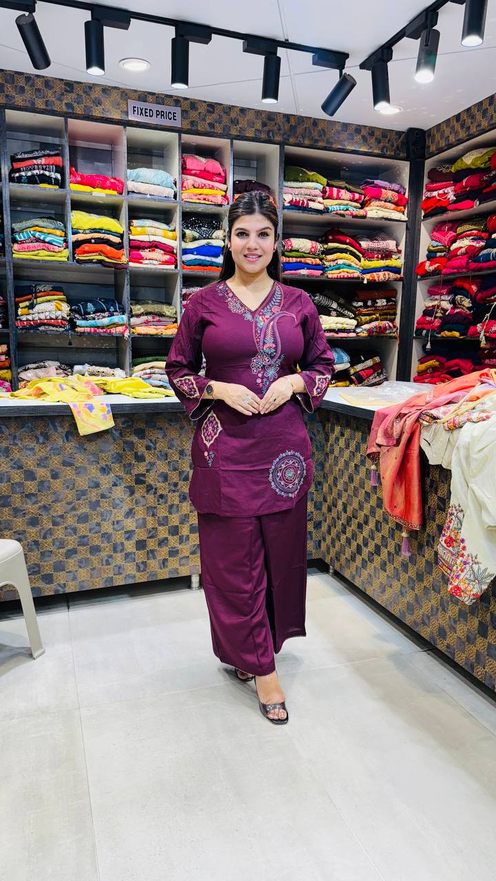 A refined 2pc ensemble crafted in premium cotton, designed in a rich maroon wine shade that exudes understated elegance. The kurta features intricate multicolour embroidery along the neckline in a graceful paisley pattern, adding a vibrant yet balanced contrast. Detailed embroidered motifs on the sleeves and a statement circular accent near the hem enhance the artistic appeal. Paired with matching straight-fit pants in the same deep tone, this set offers a clean, structured silhouette with subtle festive charm. Perfect for office wear, casual gatherings, and elegant everyday styling.