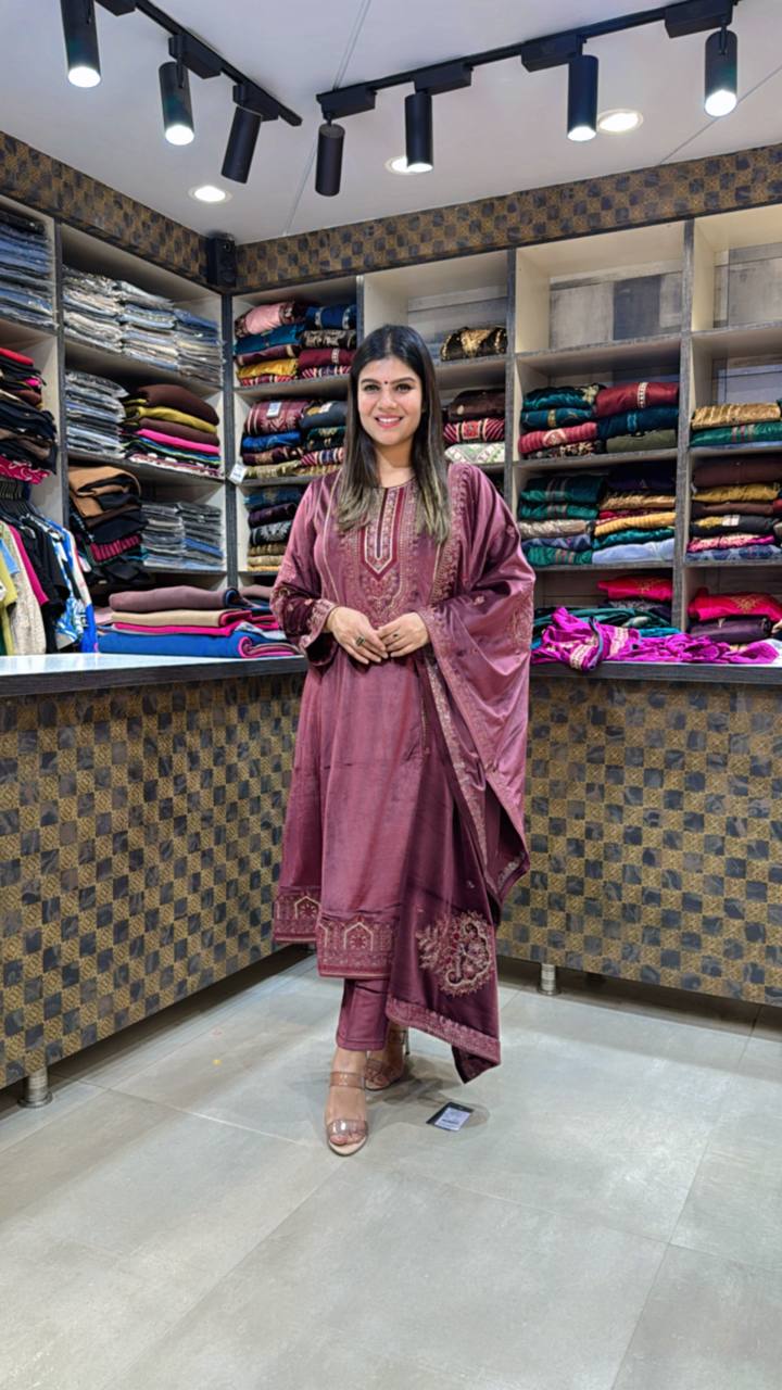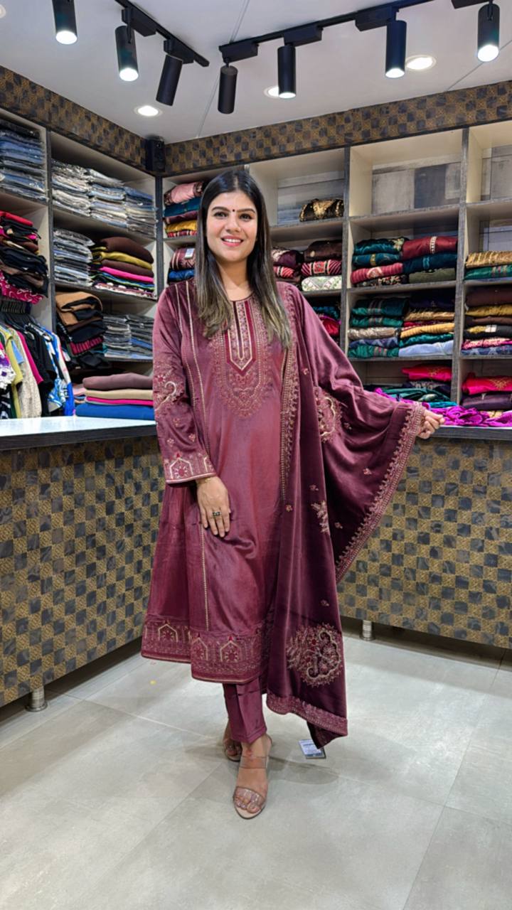 Crafted from premium velvet fabric, this rich merlot-hued ensemble exudes royal sophistication. The kurta features intricate tone-on-tone embroidery on the neckline, sleeves, and hemline, adding depth and dimension to the luxurious base. Paired with matching pants and a velvet dupatta adorned with detailed thread motifs, the outfit radiates warmth and festive charm. Perfect for evening occasions, this look blends opulence with timeless elegance.