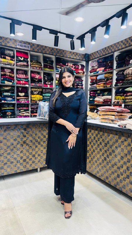 A timeless 3pc ensemble designed in a deep jet black shade that speaks pure elegance. The shirt features intricate tonal embroidery on the neckline, sleeves, and hemline, creating a refined and luxurious texture without overpowering the look. Subtle scattered embellishments across the front add depth and a soft festive shimmer. Paired with straight matching pants detailed at the hem and a coordinated black dupatta, this outfit delivers a sleek, graceful silhouette perfect for evening gatherings, formal dinners, and classic festive wear.