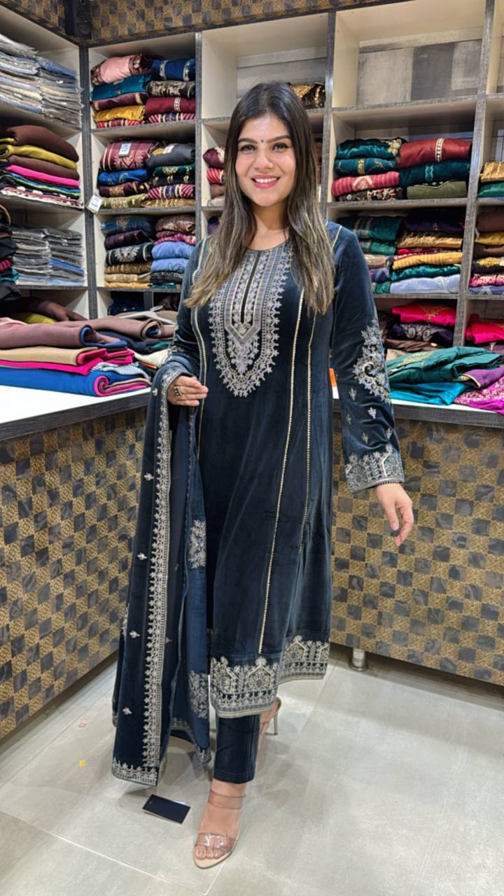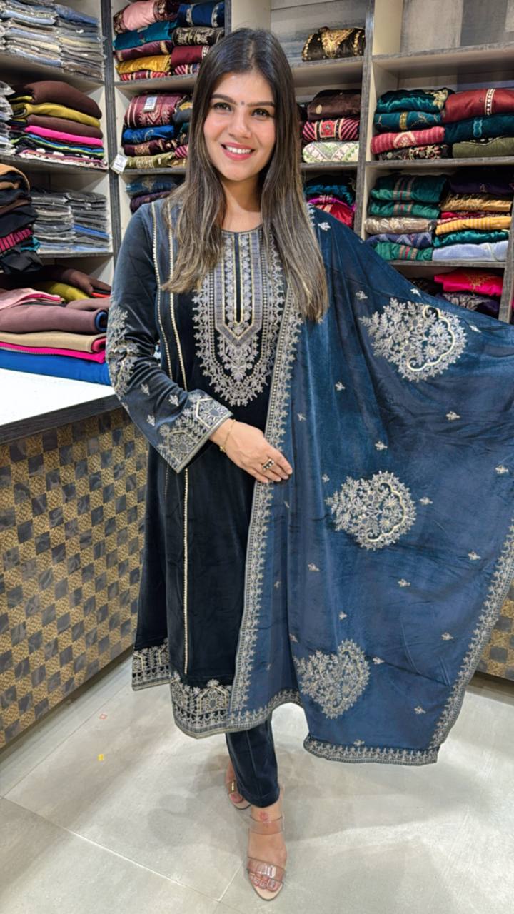 Drape yourself in timeless luxury with this deep navy velvet suit set, crafted from premium velvet fabric that exudes royal elegance. The kurta features intricate silver thread and zari embroidery along the neckline, sleeves, and hem β adding a regal shimmer to the rich base. Paired with matching velvet pants and a silk-finish dupatta beautifully adorned with ornate silver motifs, this ensemble radiates grace and sophistication. Perfect for evening celebrations, festive occasions, or winter weddings.