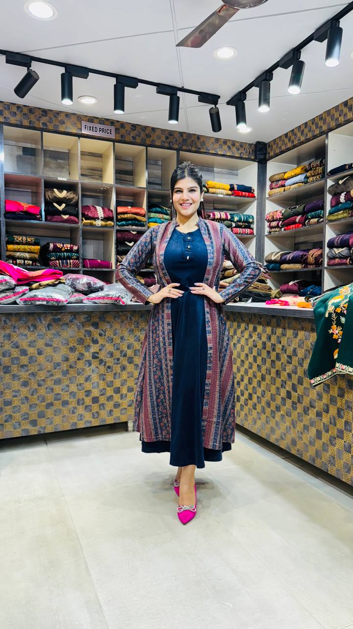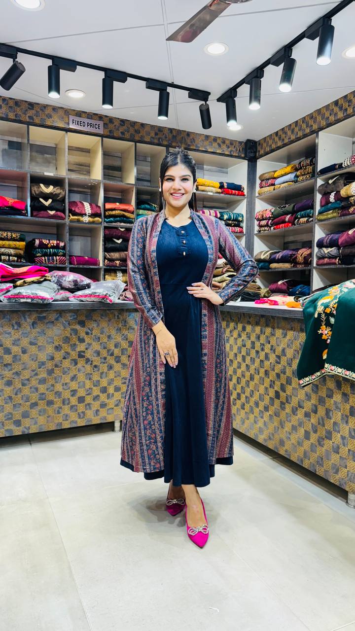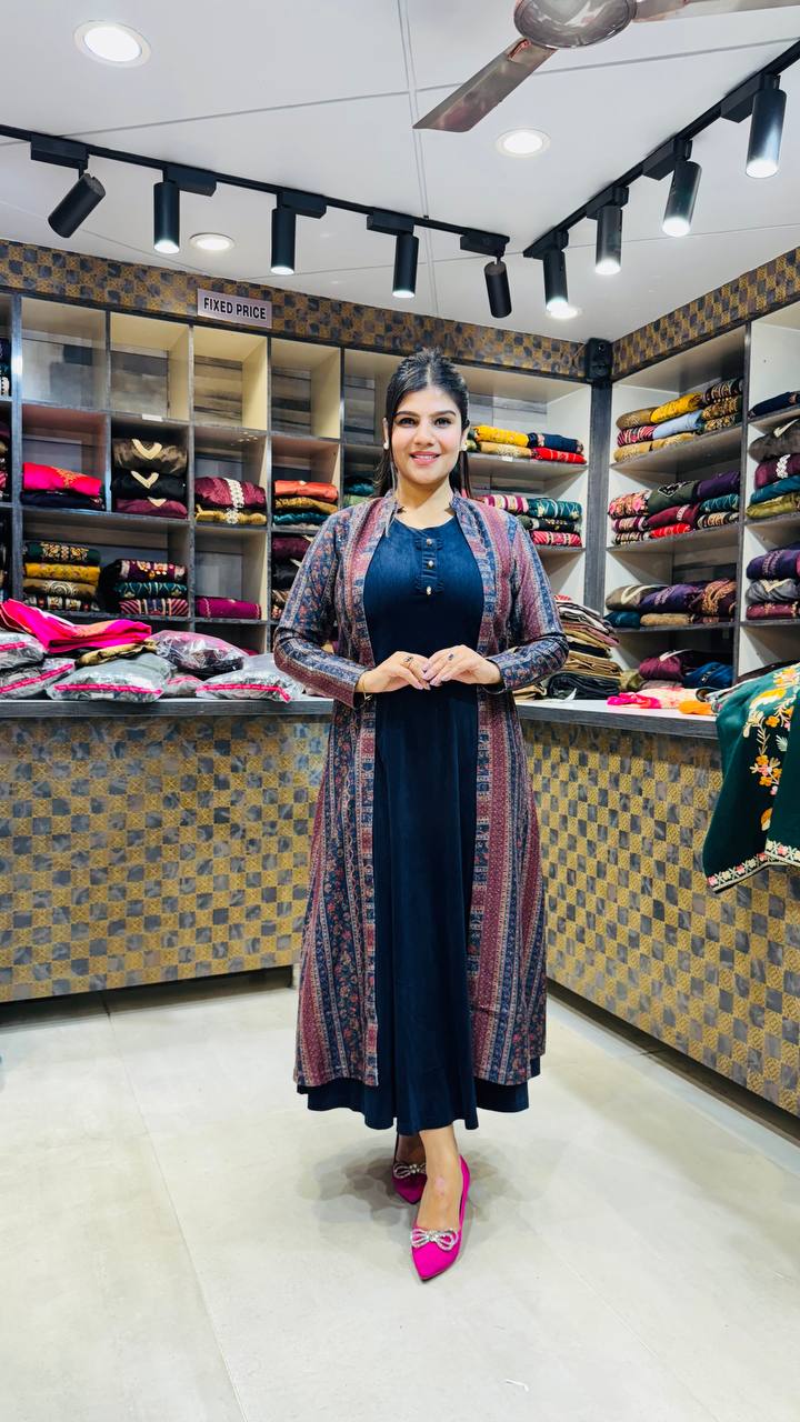 A blend of sophistication and modern elegance β this deep navy blue premium imported gown paired with a woven-pattern shrug is a true fashion statement. The solid inner exudes minimal charm, while the long shrug adds a layer of richness with its intricate ethnic-inspired print. Crafted from premium imported fabric, this outfit ensures both comfort and luxury, perfect for festive events, evening gatherings, or elegant parties.
