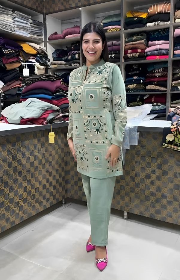 Mintira is a soft premium-velvet 2-piece suit crafted in a refreshing Mint Green shade, highlighted with intricate geometric + floral embroidery and subtle mirror accents that add shimmer without overpowering the look.