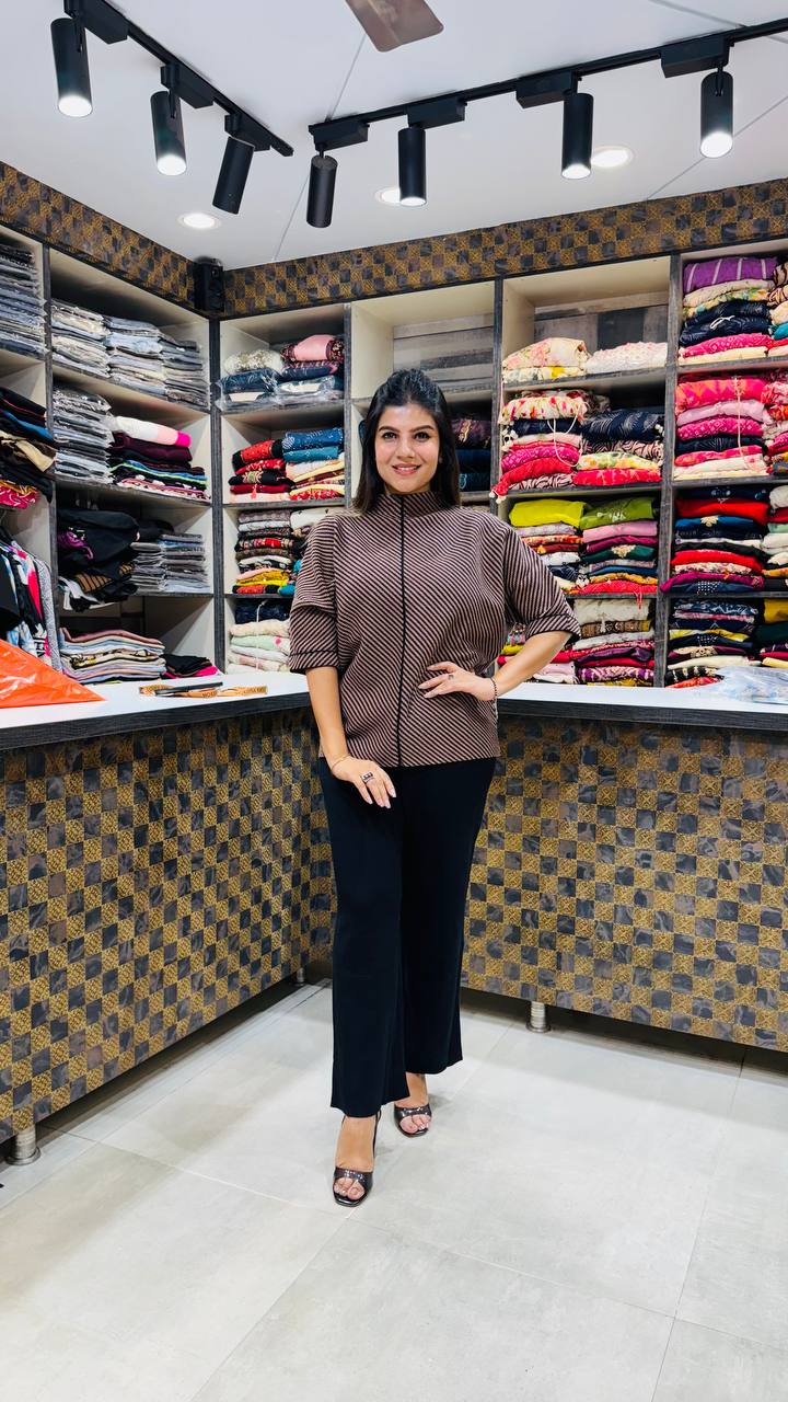 A modern blend of elegance and comfort, this outfit in Premium Imported Fabric features a mocha brown striped top paired with solid black trousers. The high-neck front-zip design adds a chic and structured look, while the soft flowy fabric ensures effortless style. Perfect for casual outings, office wear, or evening meet-ups — this set defines understated sophistication with a trendy twist.