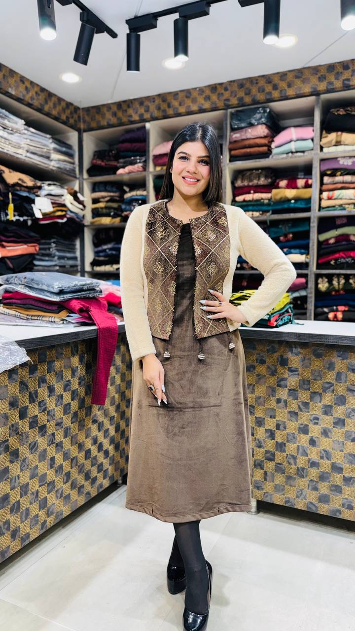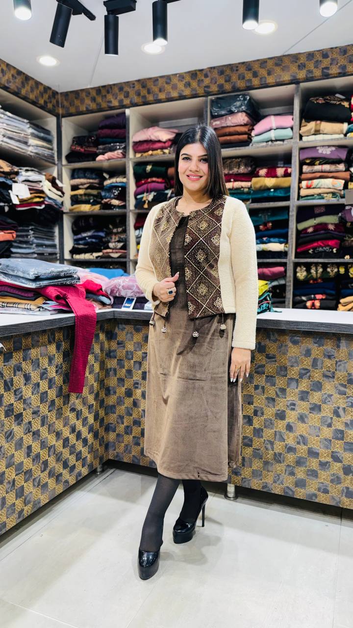 Paired with a cream-and-brown embroidered shrug featuring geometric patterns and tassel details, the outfit blends comfort with sophistication — perfect for winter outings, casual dinners, or cozy festive styling.
