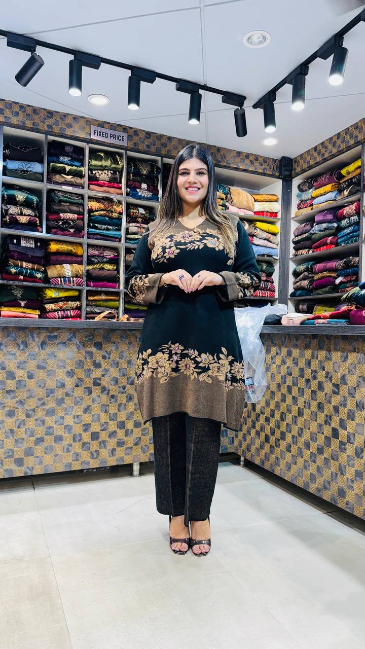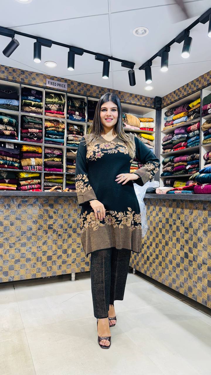 Embrace winter elegance with our Premium Knitted 2-Piece Set in a sophisticated Deep Mocha Black tone, enriched with golden-beige floral embroidery. The design features intricate threadwork blooming across the neckline, sleeves, and hemline — creating a graceful fusion of warmth and artistry. Crafted from soft, stretchable, and cozy knitting fabric, this ensemble ensures comfort without compromising on style. Perfect for refined gatherings or everyday luxe looks, Mocharra radiates timeless poise and charm.