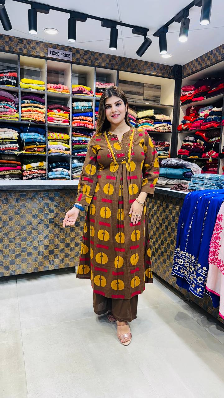 The kurti features a relaxed A-line silhouette with soft gathers at the waist, enhancing the overall fall and comfort. Subtle neckline detailing adds charm, while the three-quarter sleeves keep the look balanced and refined. Paired with solid brown straight-fit pants, this set blends comfort, stretch, and statement style effortlessly.