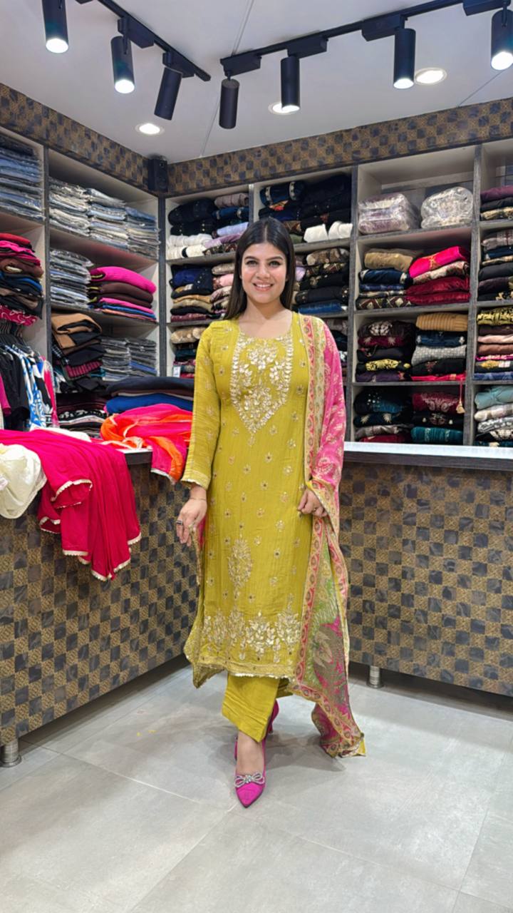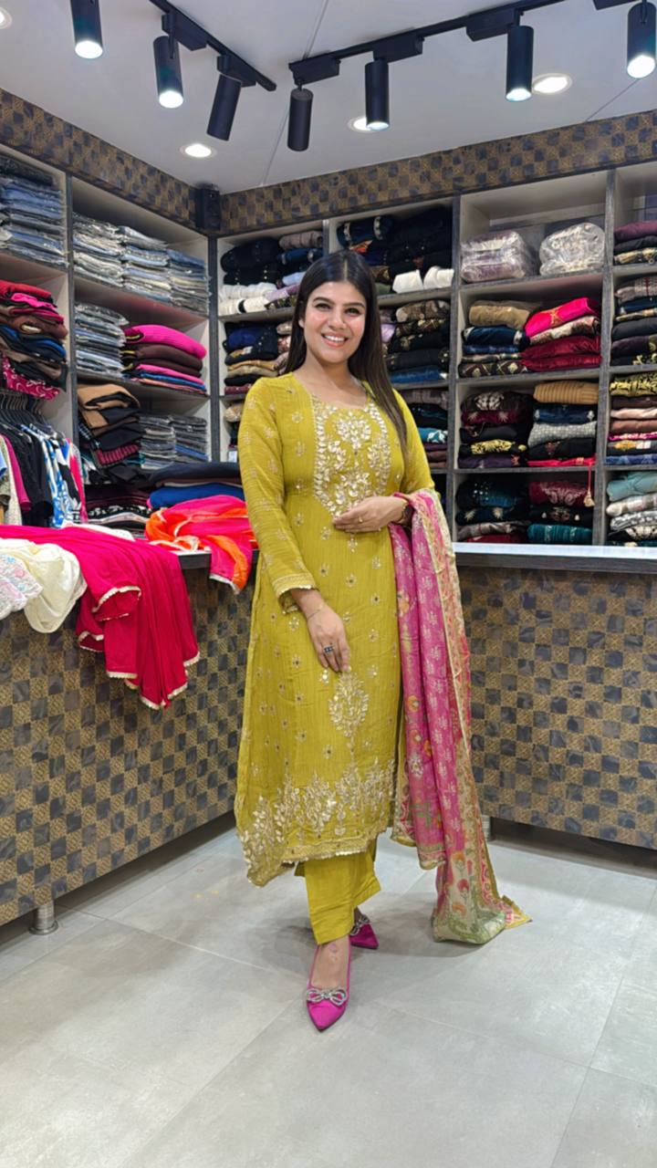 A radiant blend of tradition and trend, MustardGlow is crafted from Premium Silk Fabric adorned with exquisite Gota Patti detailing. The rich mustard-yellow base shines with intricate handwork and floral motifs that add a festive glimmer to the outfit. Paired with matching silk pants and a vibrant contrast dupatta in pink and gold tones, this ensemble exudes elegance and warmth — perfect for festive gatherings, mehndi functions, or elegant day events.