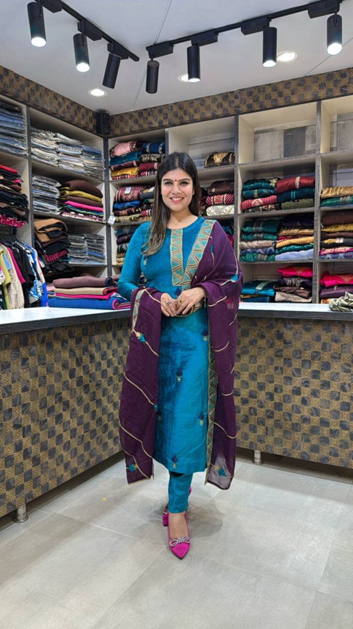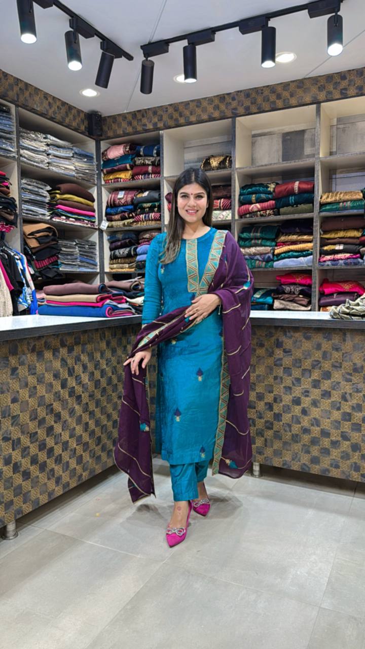 Elegance meets comfort in TealMystique, crafted from Premium Stretchable Cotrize Fabric that offers a luxurious feel and graceful fall. The rich teal blue base is enhanced with geometric threadwork detailing in gold and plum tones, giving it a refined festive touch. Paired with matching cotrize pants and a contrasting deep plum dupatta accentuated with embroidered motifs and golden piping, this ensemble exudes a perfect fusion of modern sophistication and traditional richness β ideal for festive gatherings or evening soirΓ©es.