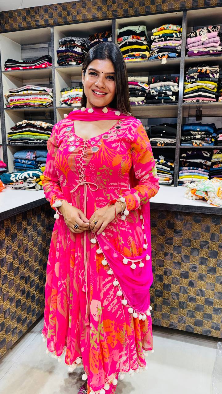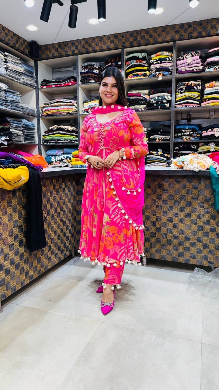 A radiant hot pink and orange floral printed suit crafted from premium lightweight chiffon. Adorned with playful white pom-pom lace along the hem, dupatta, and sleeves, it brings a modern twist to traditional elegance. Perfect for festive gatherings or daytime celebrations.