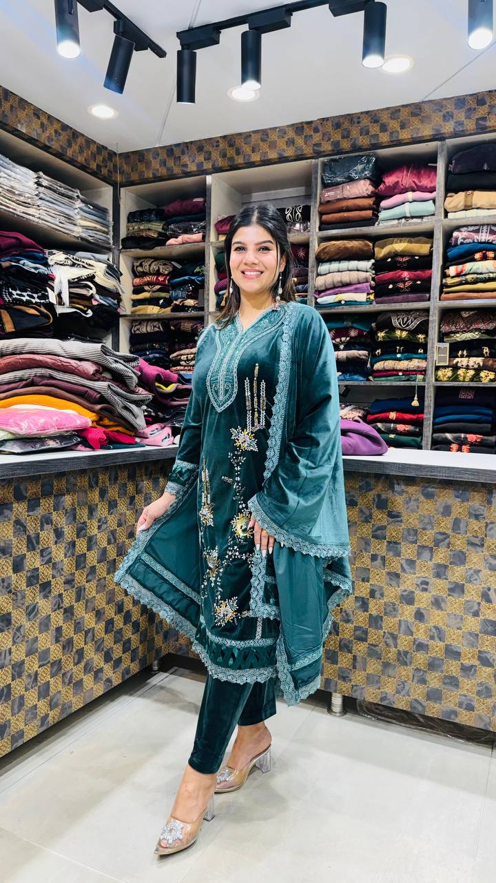 Naheera is a luxurious Deep Emerald Premium Velvet 3-Piece Suit designed with intricate hand-embellished floral motifs and crystal-style detailing.