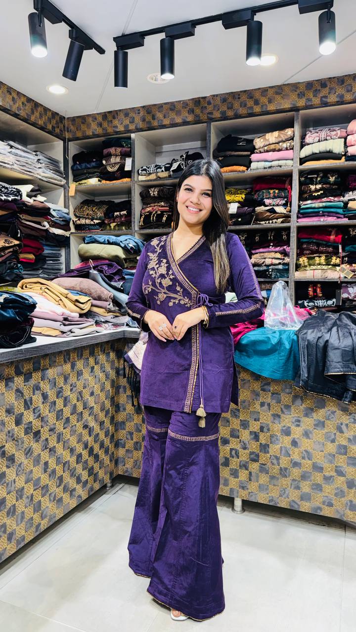 Nashita is a Premium Cotrize 2-Piece Garara suit in a deep royal purple tone, designed for graceful festive wear with a traditional edge. The short kurti features elegant gold thread embroidery in a wrap-style pattern across the neckline and chest, finished with fine borders and tassel detailing for a refined look.