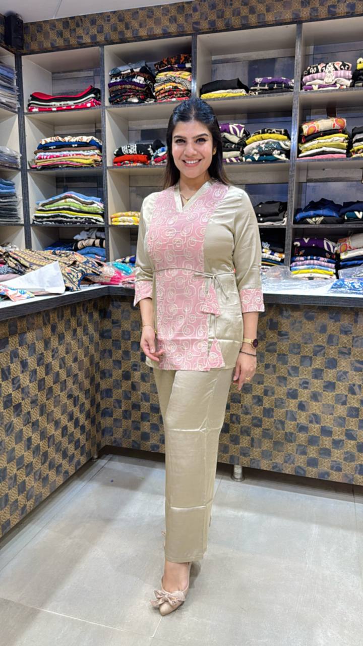 A chic beige crape silk suit enhanced with soft blush pink printed paneling in the front and sleeves. The straight-cut design with a sleek waist-tie detailing gives it a graceful, modern look. Paired with matching trousers, this outfit perfectly blends simplicity with sophistication.