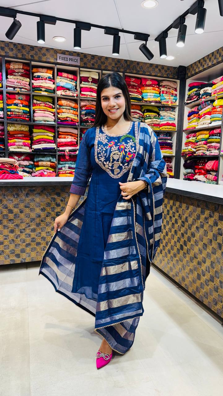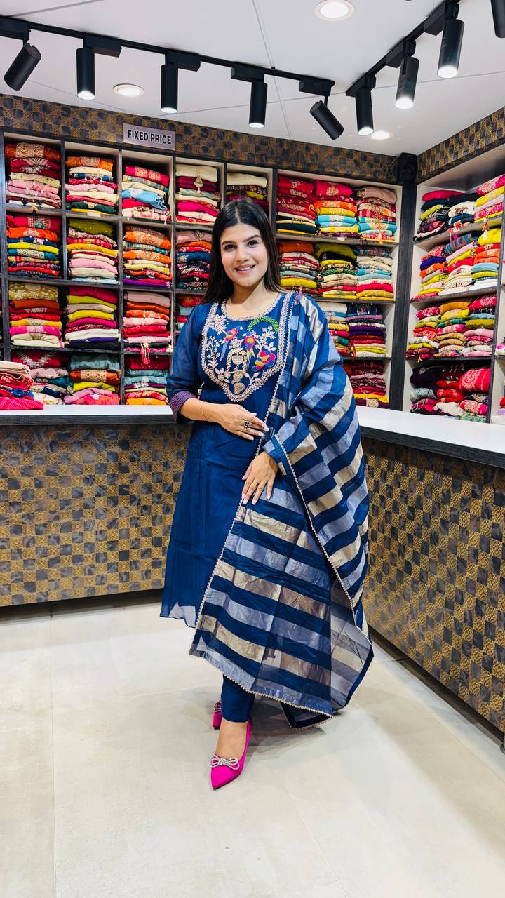 π¨ Colour: Navy Blue with Multicolour Embroidery & Silver Striped Dupatta