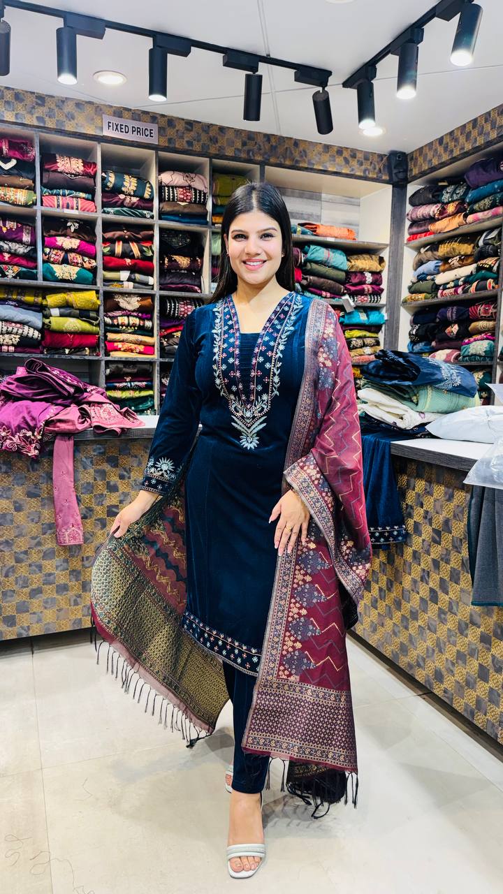 Nayara is a Premium Mat-Finish Imported Velvet 3-Piece suit crafted in a deep midnight navy blue tone that feels calm, rich, and winter-perfect. The velvet shirt features fine silver-toned embroidery along the neckline, sleeves, and hem, creating a balanced contrast against the dark base without overpowering the look.