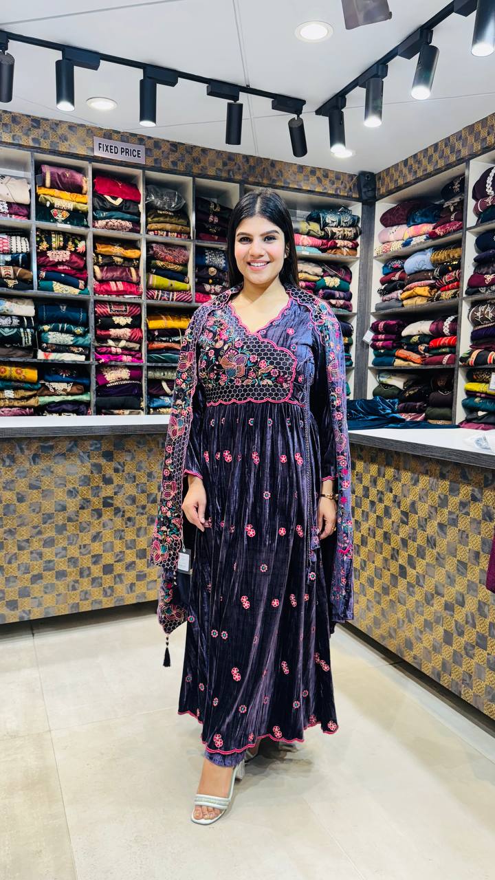 Nayara is a refined Deep Navy Premium Crush Velvet 3-piece suit, designed to make a statement through texture and detailing rather than shine. The shirt features an elegant scalloped neckline panel highlighted with intricate rose-pink embroidery, extending subtly across the bodice and hem for a balanced, graceful look.