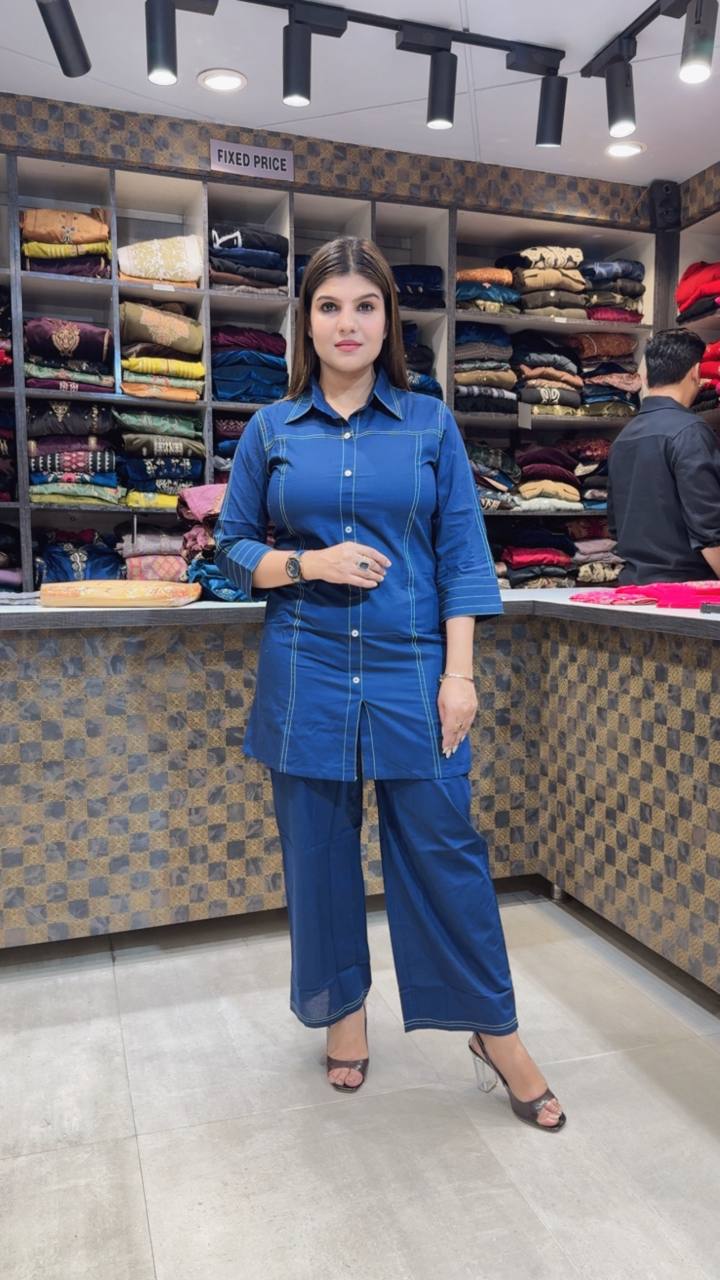 Nayara is a Premium Cotton 2-Piece ensemble in a deep steel blue shade, tailored for sharp, confident everyday wear. The shirt features a structured button-down design with contrast stitch detailing running vertically along the panels, enhancing the silhouette with a clean, streamlined finish. The collared neckline and fitted cut add a modern touch, while the matching wide-leg trousers keep the look balanced and effortless. Crisp, breathable, and polished β designed for women who prefer minimal elegance with structure.