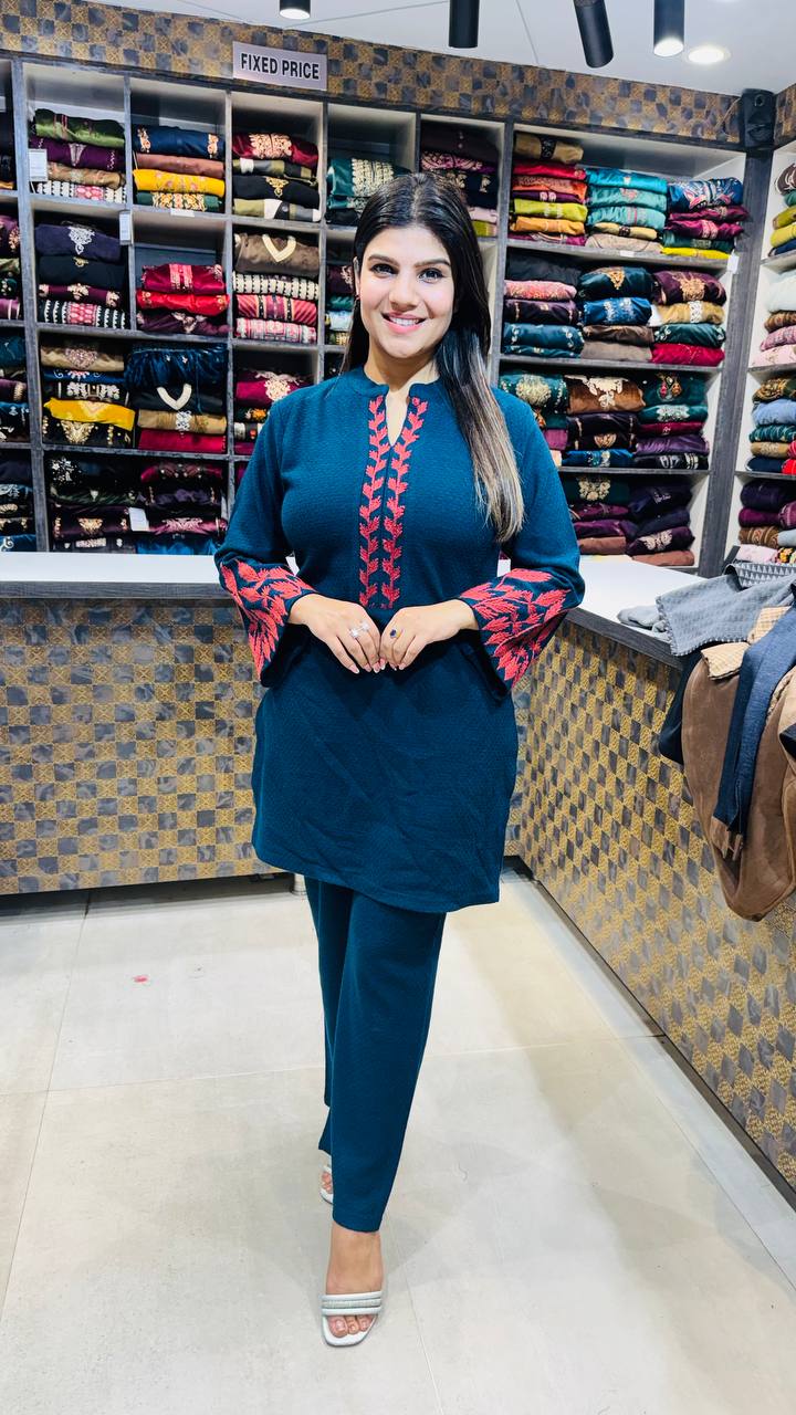 Nayela is a Premium Imported Knitted ensemble in a deep peacock-teal blue shade, designed to feel soft, warm, and effortlessly elegant. The kurta features striking rust-red embroidery running vertically along the neckline and extending onto the sleeves, creating a sharp contrast against the rich blue base.