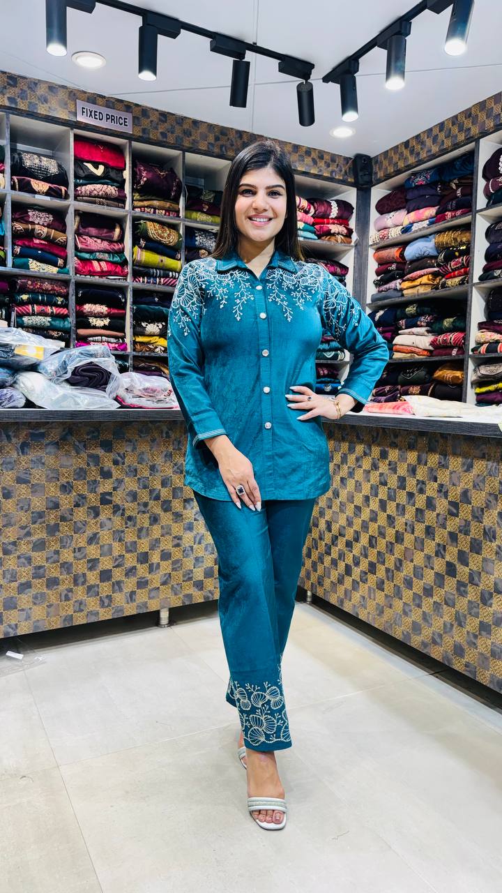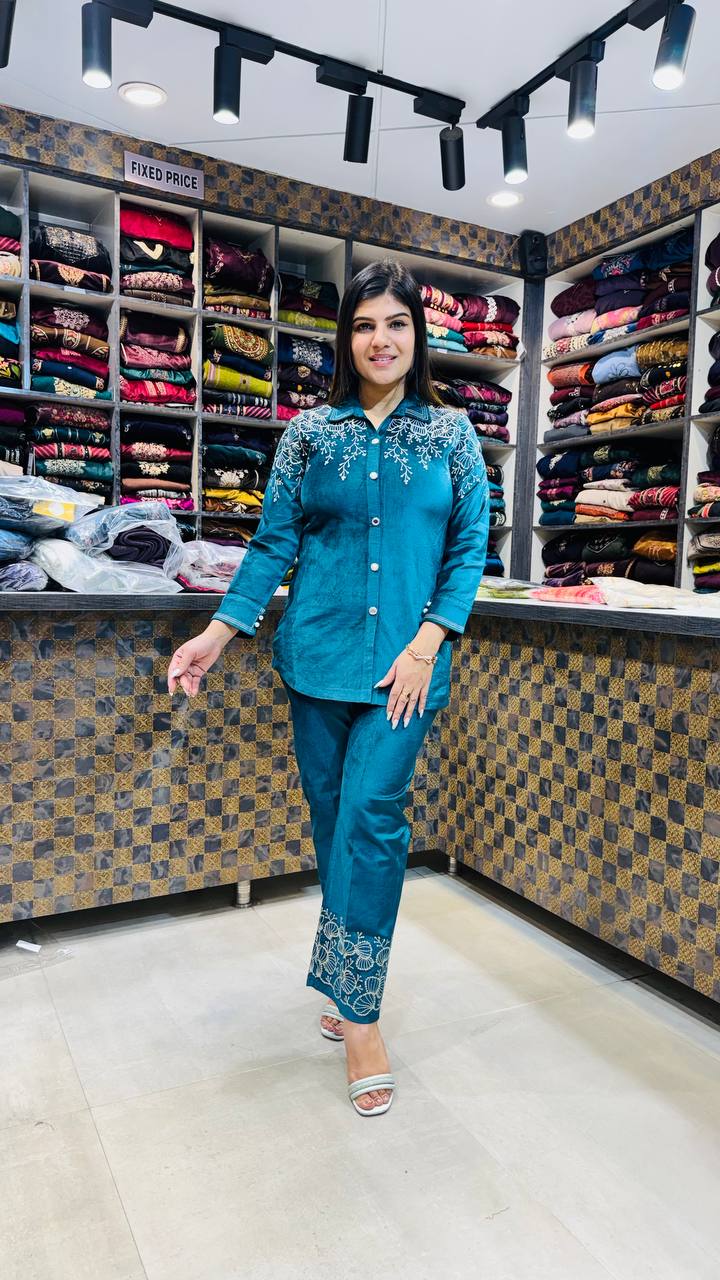 A rich teal cotrize two-piece featuring delicate white thread embroidery across the shoulders, sleeves, and pant borders. The shirt comes in a button-down style with a soft structured fall, giving it a polished yet comfortable look. Paired with a matching embroidered pant for a coordinated, elegant finish.