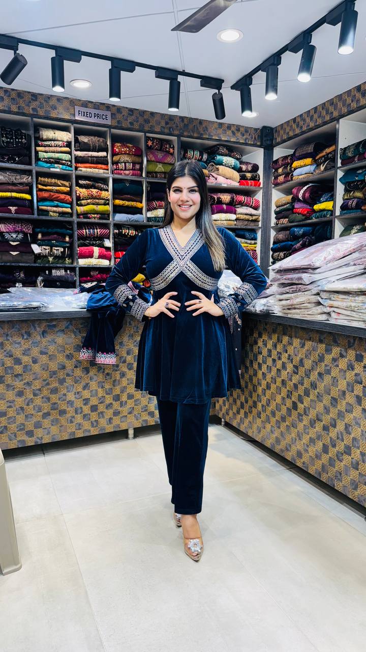 Neelma features a deep royal blue premium velvet 2-piece set crafted with elegant silver geometric embroidery across the neckline, waist panel, and sleeves. The soft, plush velvet adds a luxurious winter feel, while the fitted straight pants complete the sophisticated silhouette. Perfect for premium winter gatherings and modern festive wear.