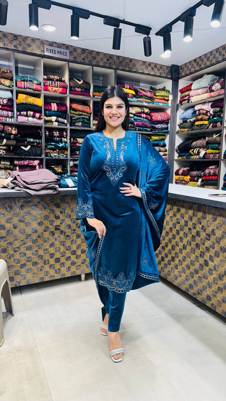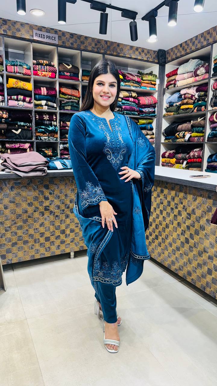 Neysa is a Premium Velvet 3-Piece suit crafted in a rich teal-blue shade that reflects depth, softness, and winter luxury. The velvet shirt features fine tonal embroidery across the neckline, sleeves, and hem, creating a refined flow without overpowering the base colour.