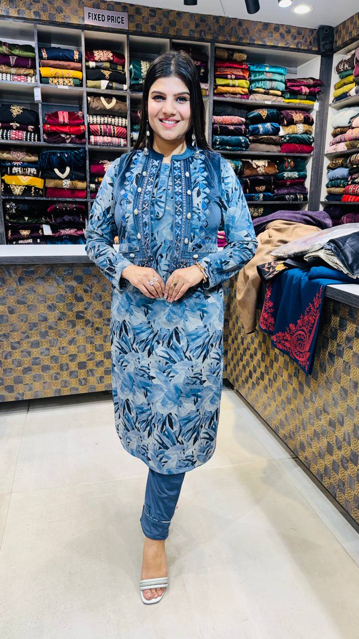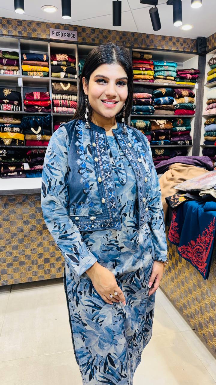 Nilaya is a Premium Suede 3-Piece ensemble designed in a calm steel-blue base with layered botanical prints that feel refined, not loud. The shirt features an all-over leaf-inspired pattern in soft blue and slate tones, paired with a detailed embroidered placket that adds structure and depth.
