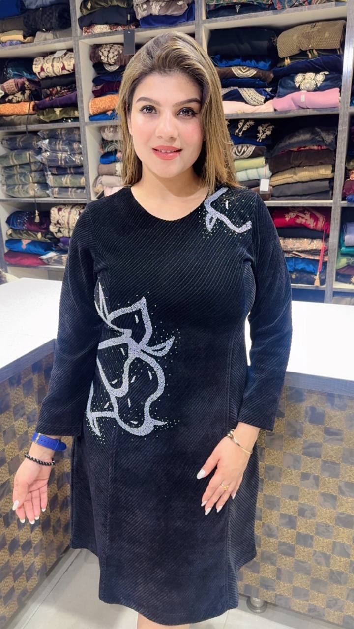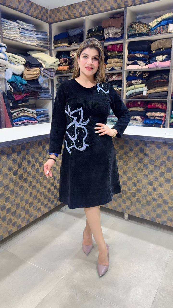 Noctelle is a Premium Cotrize winter dress crafted in a deep midnight black tone, designed for bold yet effortless elegance. The soft textured fabric provides warmth and structure, while the modern abstract silver detailing across the front adds a statement, contemporary edge.