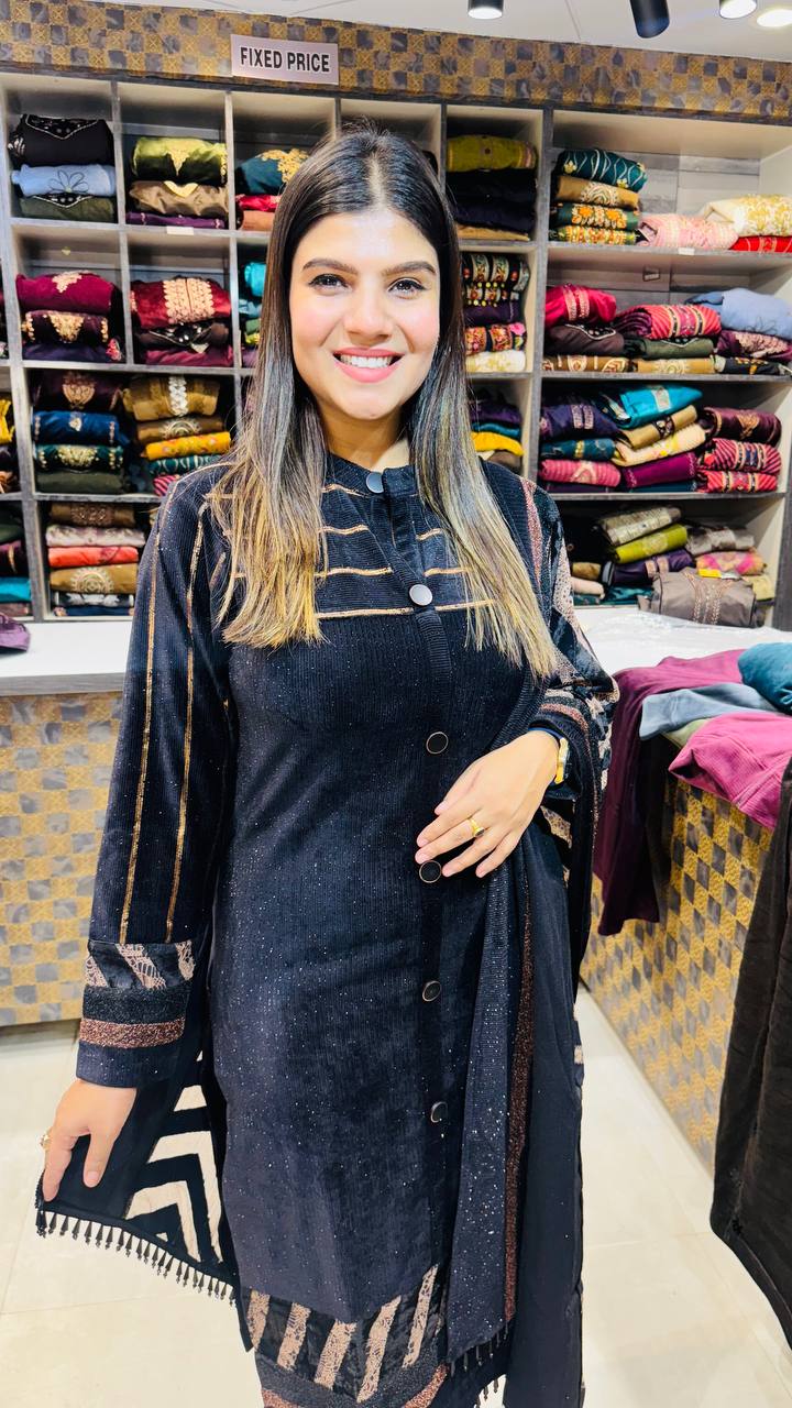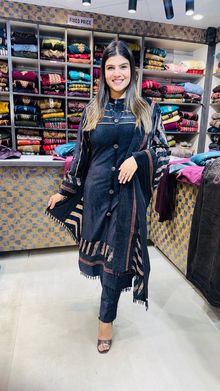 Introducing Noctira, a bold and luxurious winter 3-piece set crafted in rich Black Premium Velvet with subtle shimmer detailing. The kurta features a buttoned front panel, elegant structured neckline, and soft velvet fall that enhances the silhouette.