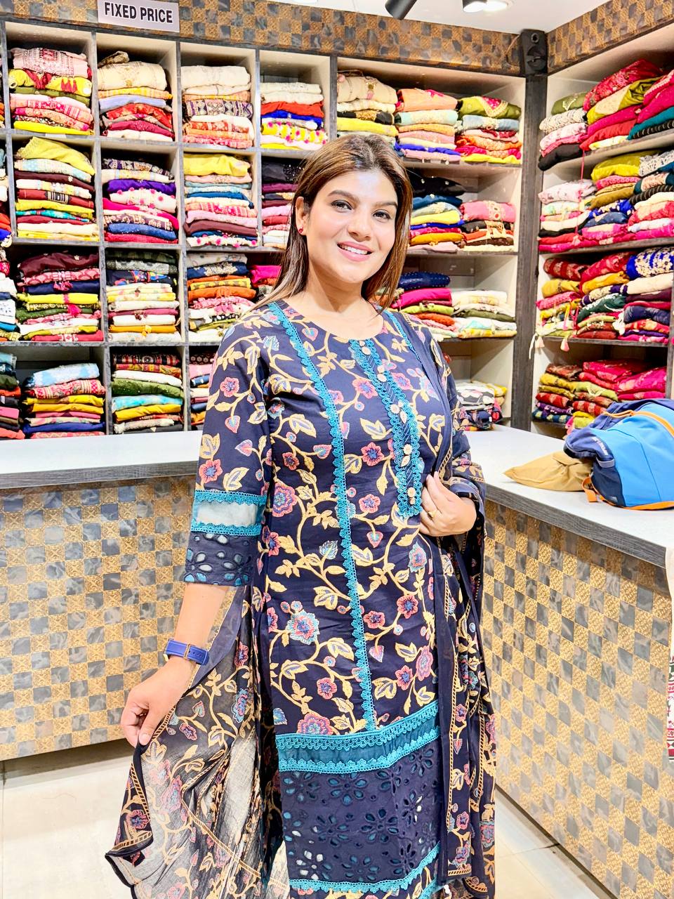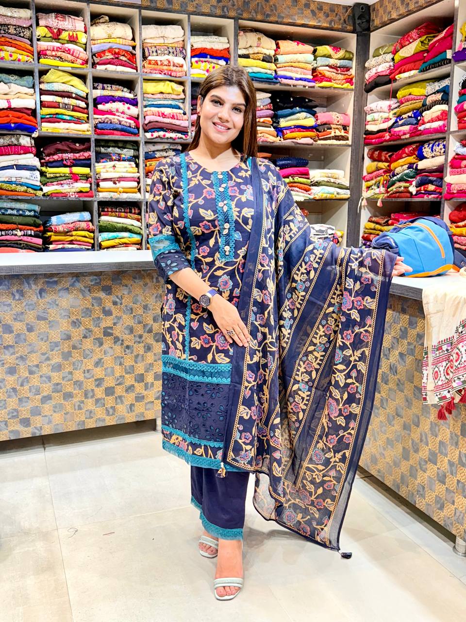 Noctura is a refined Premium Cotton 3-piece suit crafted in a Blue base, beautifully highlighted with intricate floral vine prints. The kurti features delicate botanical motifs in soft pastel shades that gracefully spread across the fabric, creating an elegant and sophisticated look.