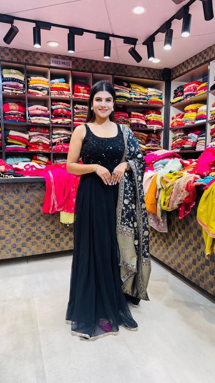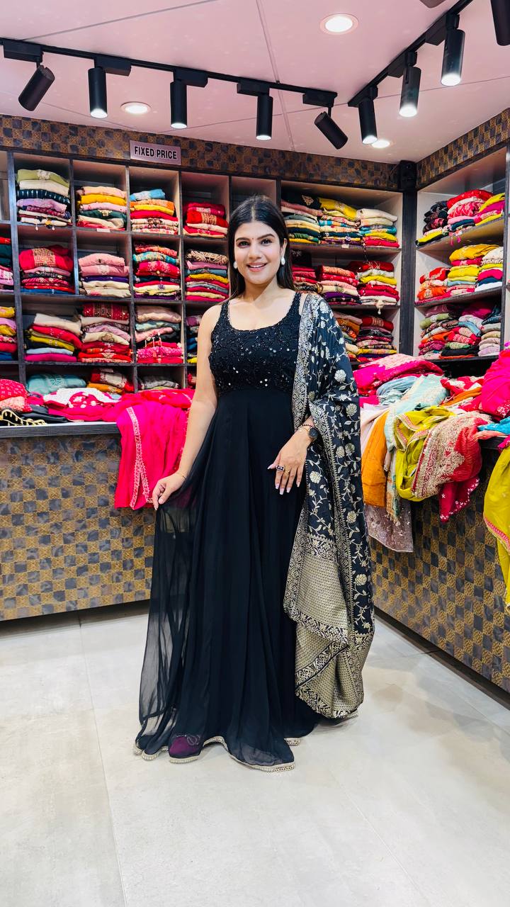 This elegant outfit is crafted in premium viscose georgette fabric, featuring a solid black gown-style silhouette adorned with delicate sequin work on the bodice for a subtle shimmer. The highlight is its luxurious black dupatta with golden zari floral weaving, adding a regal charm to the modern minimal base. Perfect for evening parties, receptions, or festive occasions, this ensemble exudes sophistication and timeless grace.