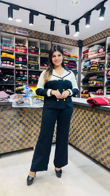 Noirelle is a Premium Knitted 2-Piece set designed in a bold black and ivory contrast that feels sharp, modern, and winter-appropriate. The shirt features a structured V-neck sailor-style collar in ivory, accented with gold-tone buttons that add a refined, statement finish. Clean paneling and contrast piping enhance the silhouette without overdoing it.