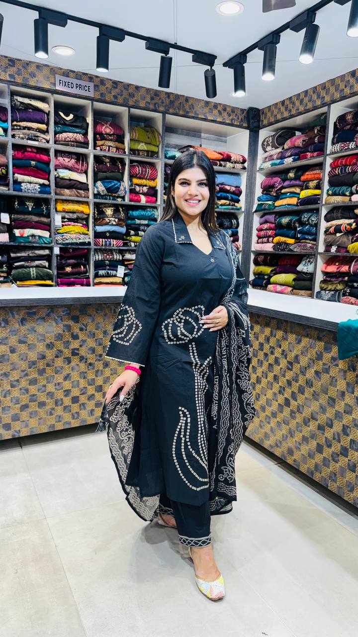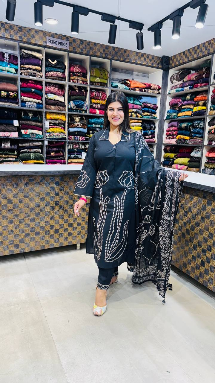 Noirra is a deep Jet Black 3-piece ensemble crafted from premium German Cotton, offering a smooth, refined fall and all-day comfort. The kurti features white mirror-dot inspired patterned detailing on the front panel, sleeves, and collar, adding a striking yet elegant dimension to the overall look.