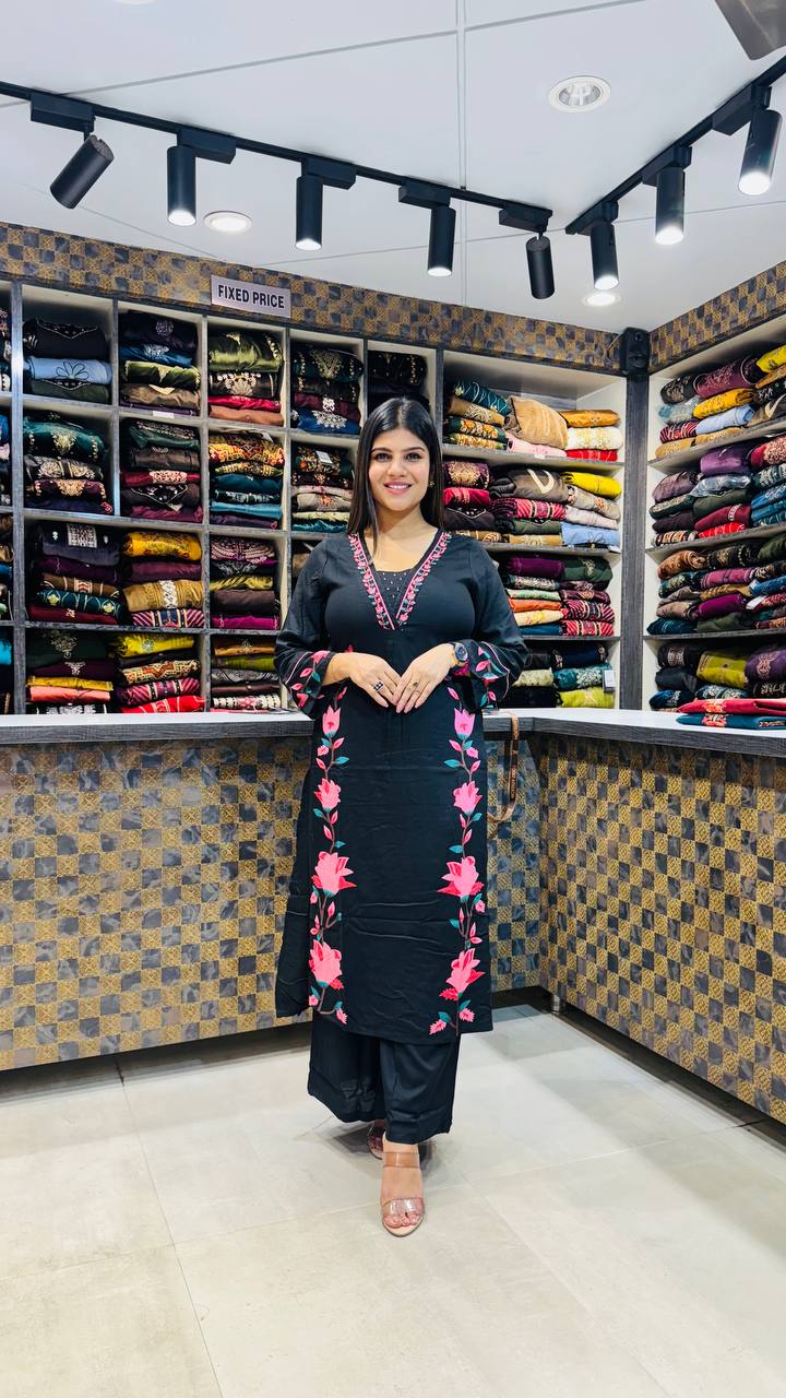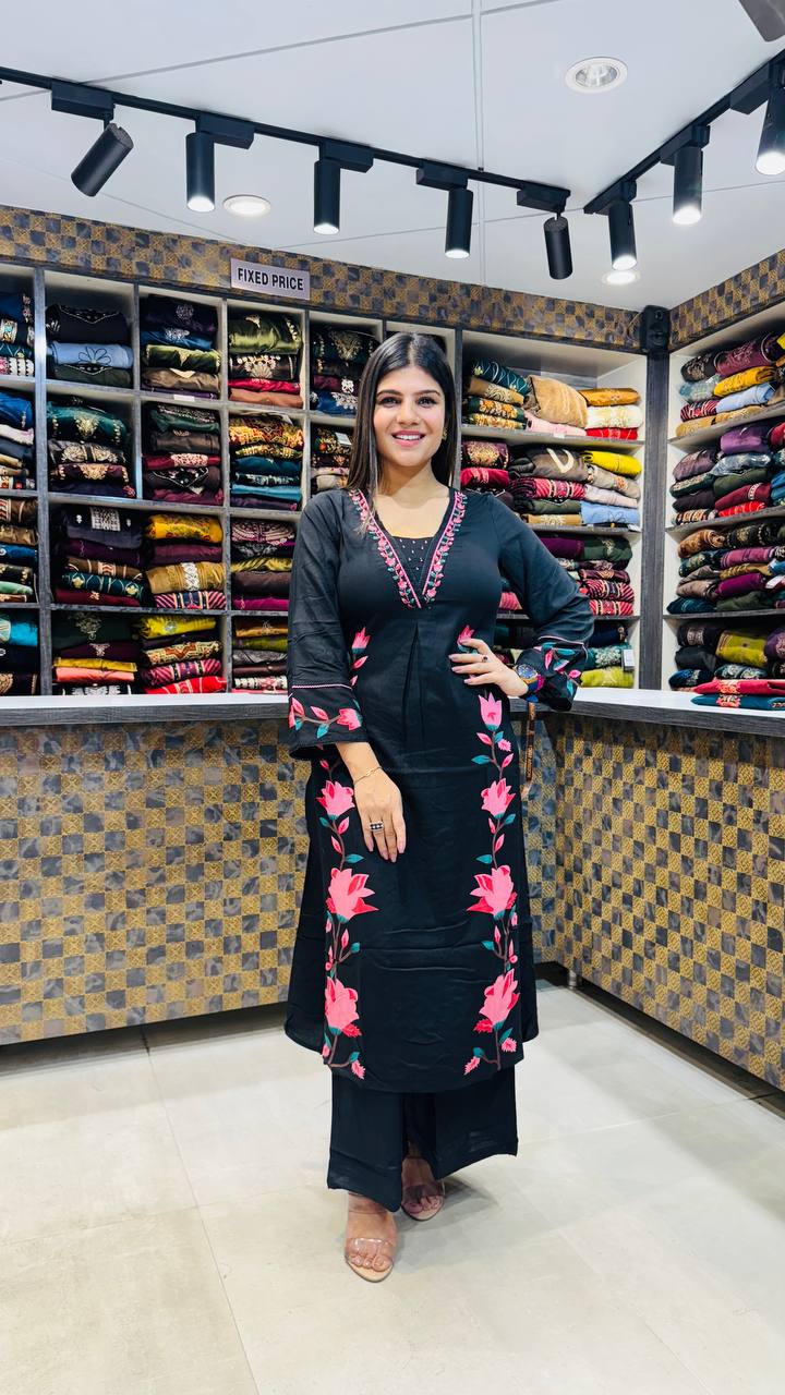 Crafted from premium German cotton, this stunning black suit set is elevated with vibrant pink floral embroidery cascading gracefully along the borders and sleeves. The V-neckline features intricate embroidered detailing that adds a refined feminine touch. With its soft, breathable fabric and bold contrast design, this ensemble blends modern sophistication with traditional charm, making it perfect for both festive evenings and elegant gatherings.
