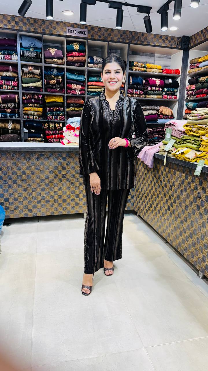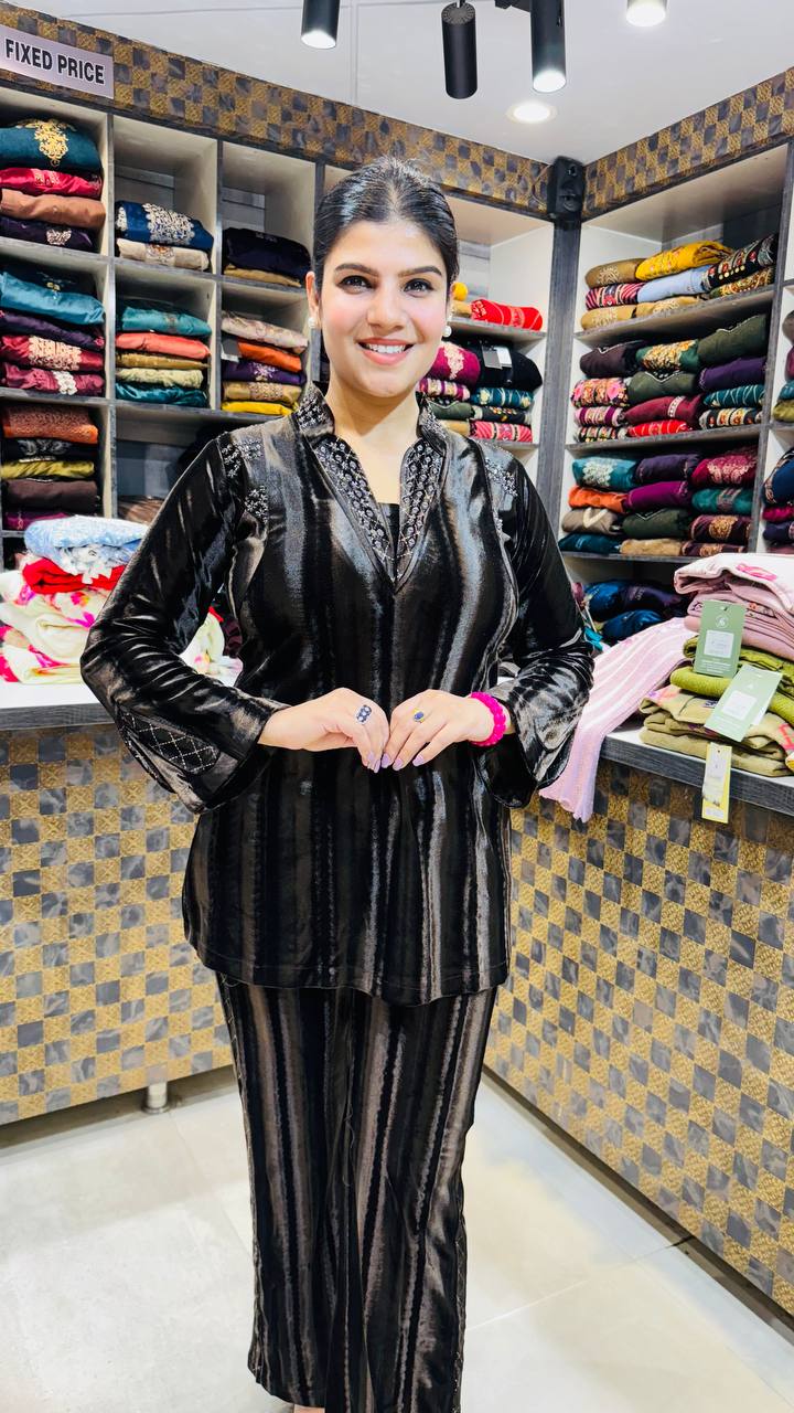 Exude timeless allure with our Premium Velvet Co-ord Set in a deep noir black hue. The plush velvet fabric shimmers with every move, giving a luxurious sheen and soft drape that defines effortless elegance. The kurta features a refined V-neck with intricate tonal embroidery, complemented by full sleeves and a graceful straight-cut silhouette. Paired with matching velvet pants, this ensemble is the epitome of modern sophistication and festive charm β perfect for evening gatherings or elegant celebrations.