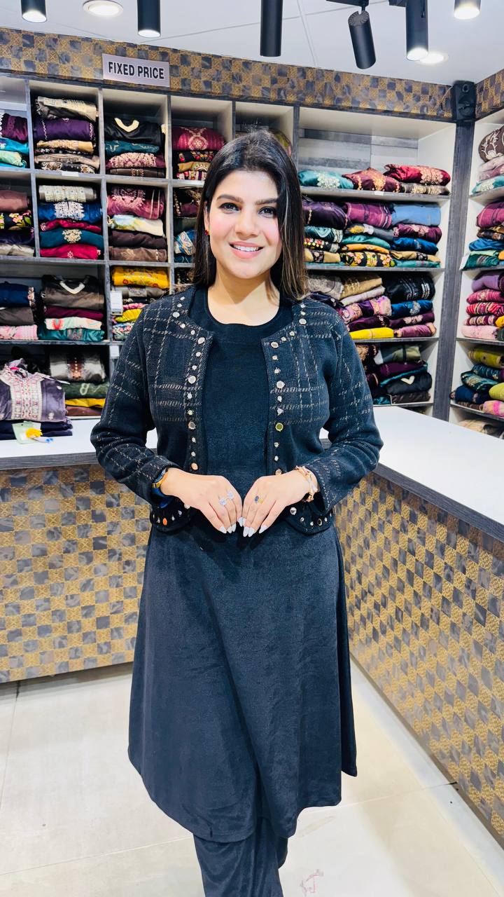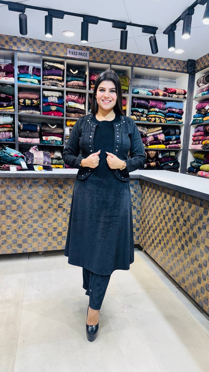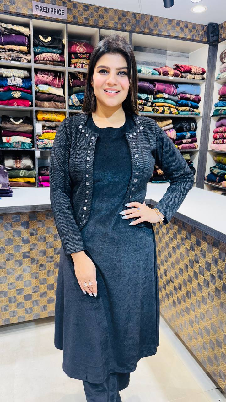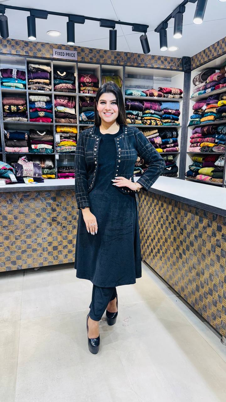 Nyra is a refined Jet Black 3-piece set crafted in Premium Velvet, designed for a sleek winter look.