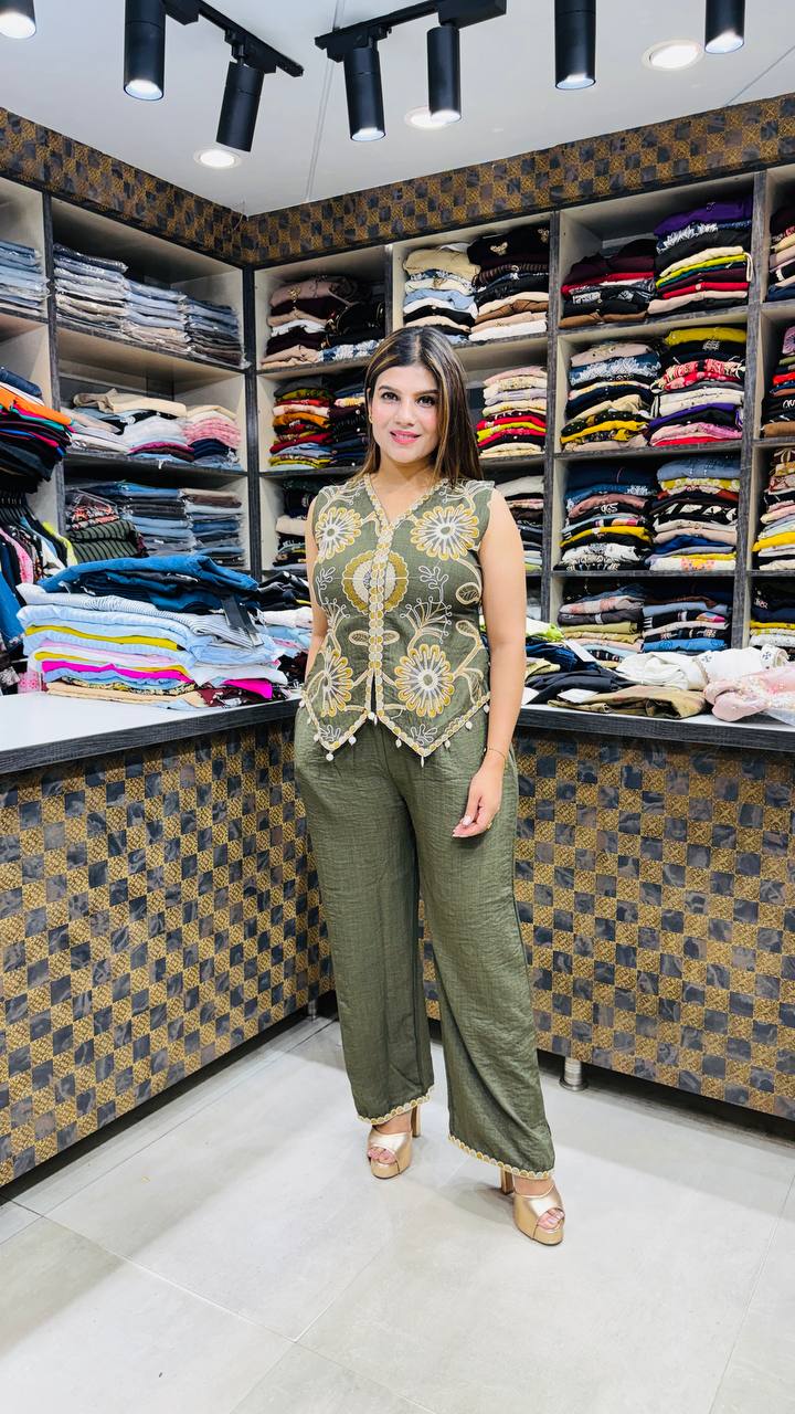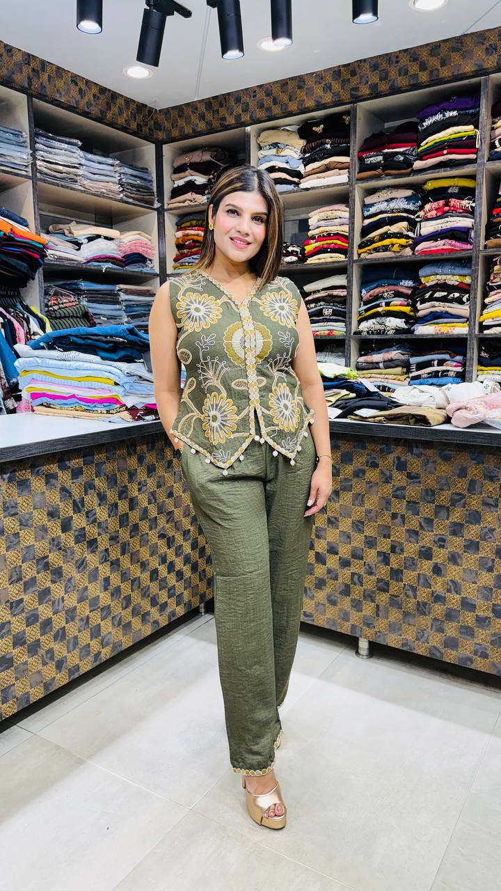 ✨ Design: Floral Embroidered Sleeveless Top • Sheer Overlay with Intricate Thread Work • Button Front Detail • Straight Comfortable Pants with Lace Hem