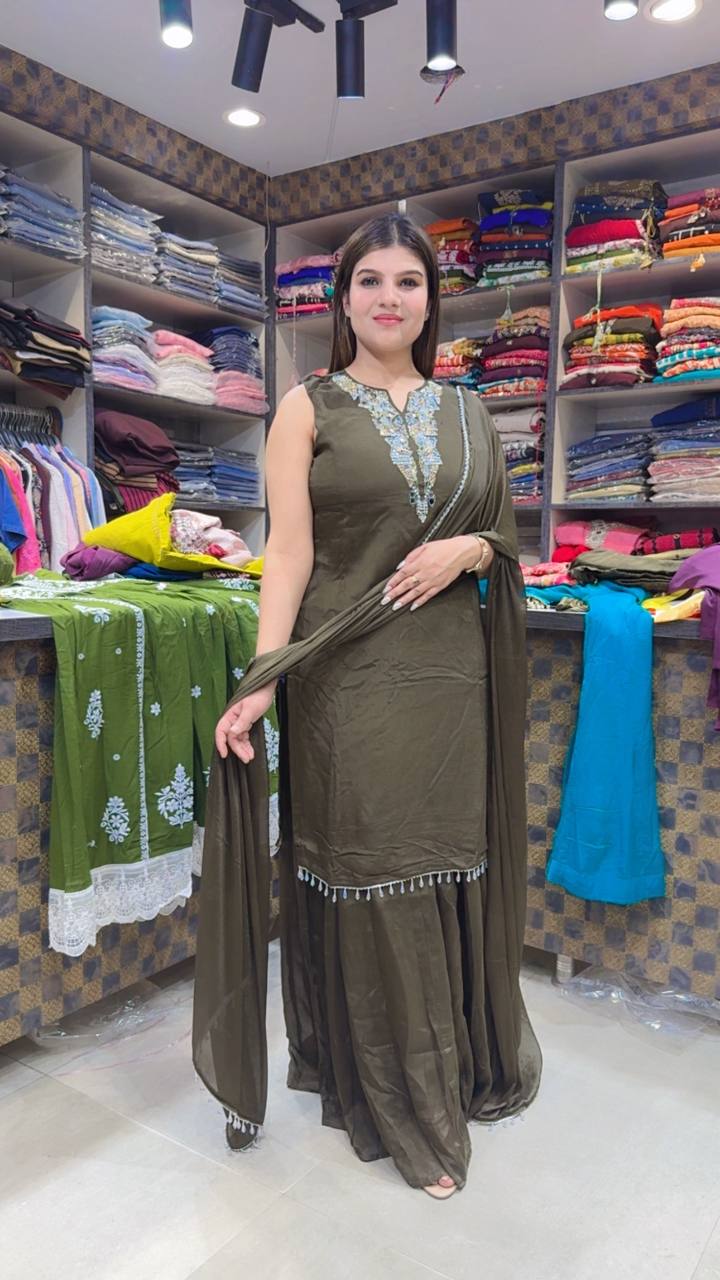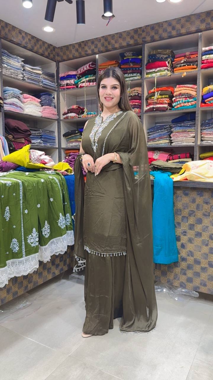 Olivea is a graceful Premium Chinon 3-piece suit crafted in a rich Deep Olive shade with a soft satin-like sheen. The shirt features intricate silver thread embroidery on the neckline, creating a refined focal point with delicate detailing. The hemline is finished with subtle tassel accents that add movement and charm.