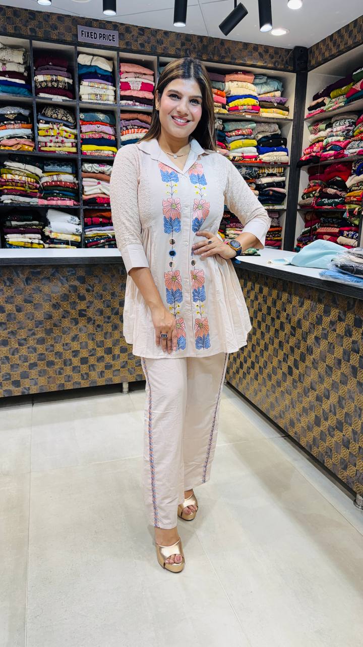 ✨ Design: Vertical Floral Embroidery • Shirt Collar with Buttons • Subtle Lace Texture Sleeves • Coordinated Straight Pants with Side Detailing