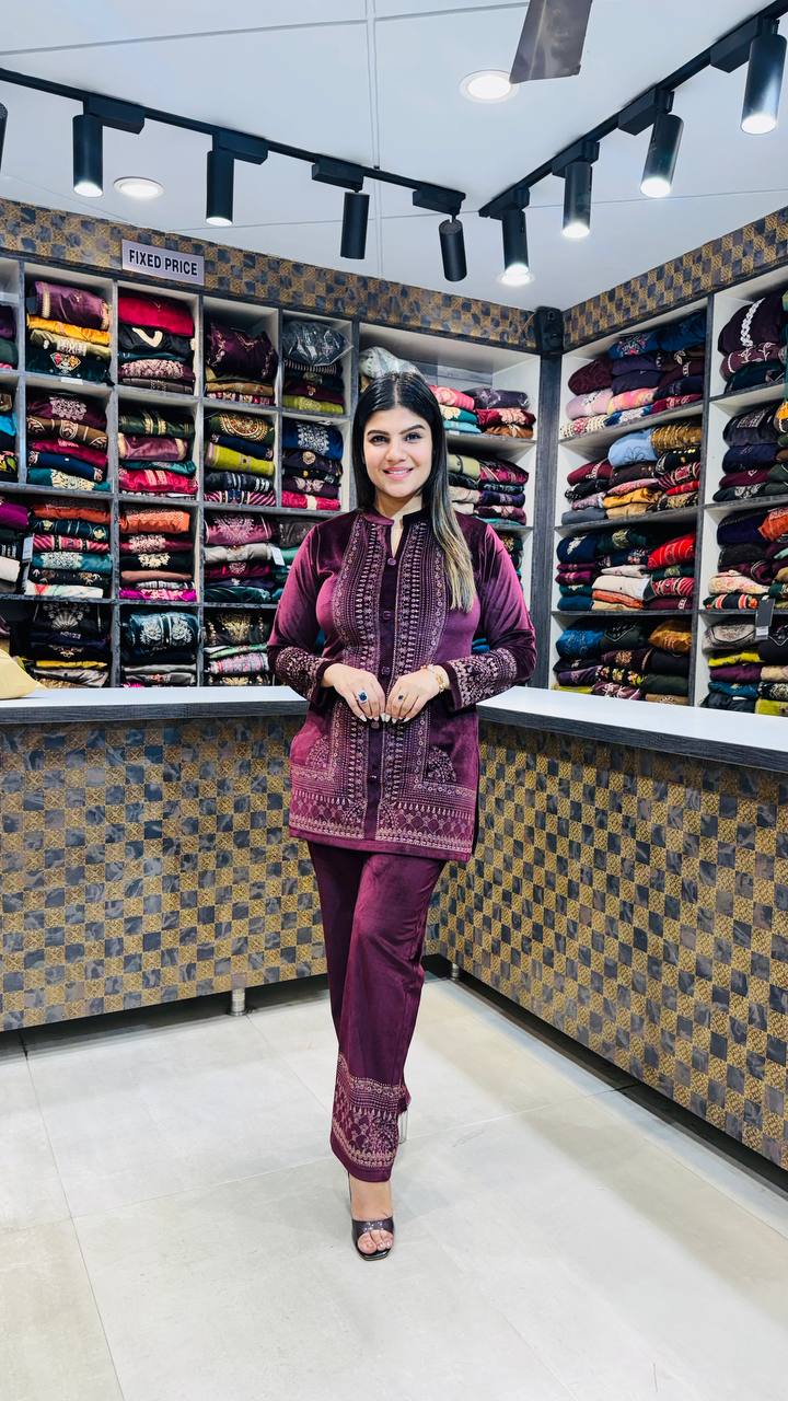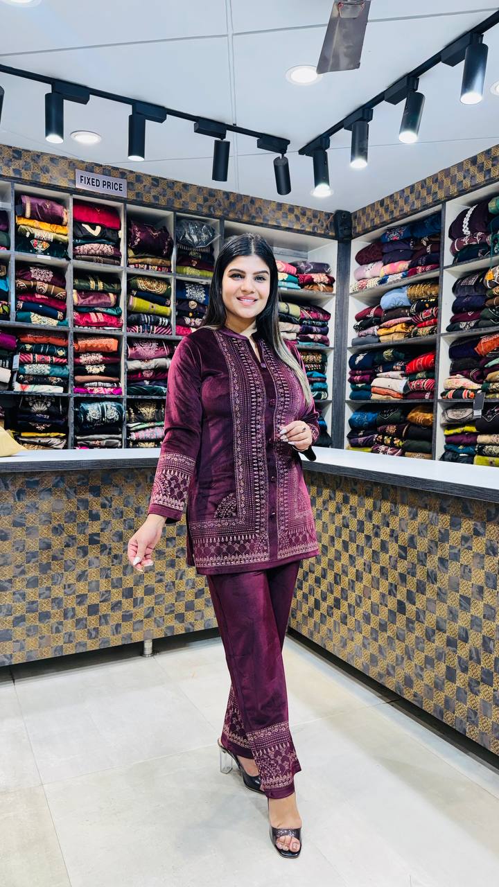 Plum is a rich premium velvet 2-piece set designed in a deep Wine-Plum shade. The shirt features intricate tonal embroidery on the front, sleeves, and borders, adding a royal handcrafted touch. The soft velvet fabric gives a luxurious shine and smooth fall, making it perfect for winter elegance. The matching velvet pants come with beautifully embroidered hems for a complete refined look.