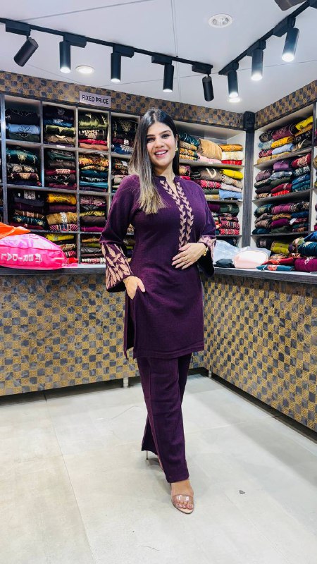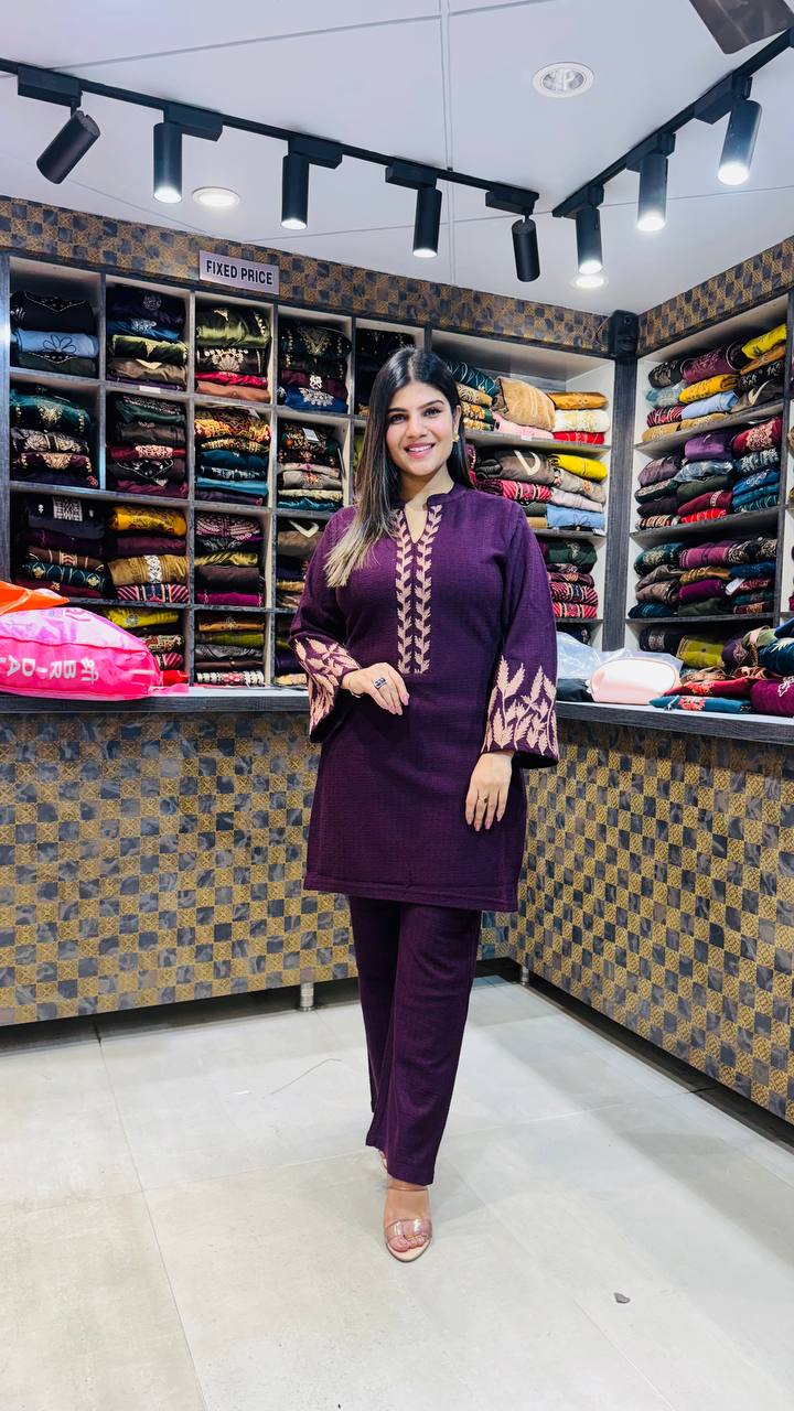 Experience luxurious comfort with our Premium Knitted 2-Piece Set in an elegant deep plum shade. The kurta features delicate contrast embroidery on the neckline and flared sleeves, adding a graceful flair to its modern silhouette. Paired with matching straight-fit pants, this ensemble is the perfect fusion of warmth, sophistication, and timeless beauty β ideal for winter evenings or casual festive gatherings.