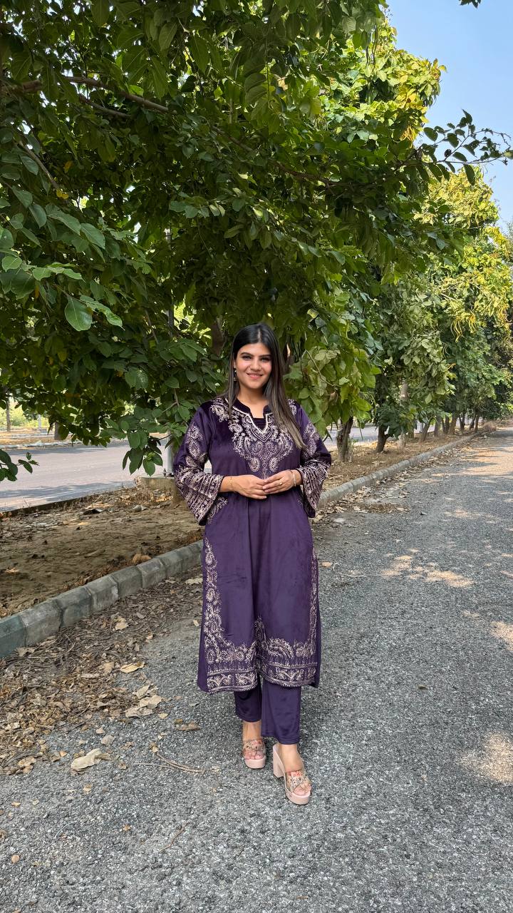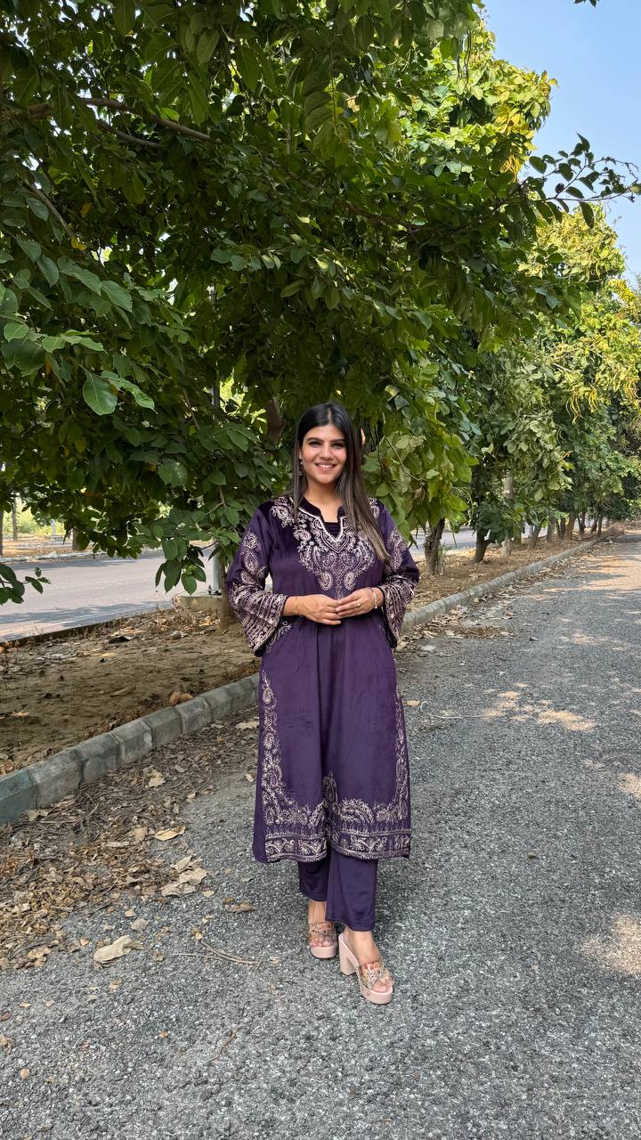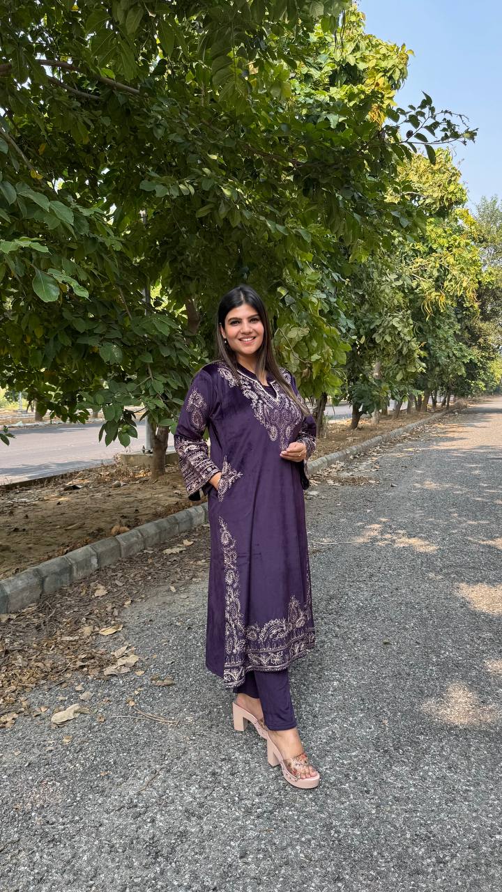 Crafted from premium velvet fabric, this stunning ensemble radiates luxury and elegance. The rich plum purple shade paired with detailed golden embroidery creates a royal and graceful aura. The soft velvet texture drapes beautifully, making it ideal for festive evenings and winter celebrations. A perfect blend of comfort and class for those who adore timeless sophistication.