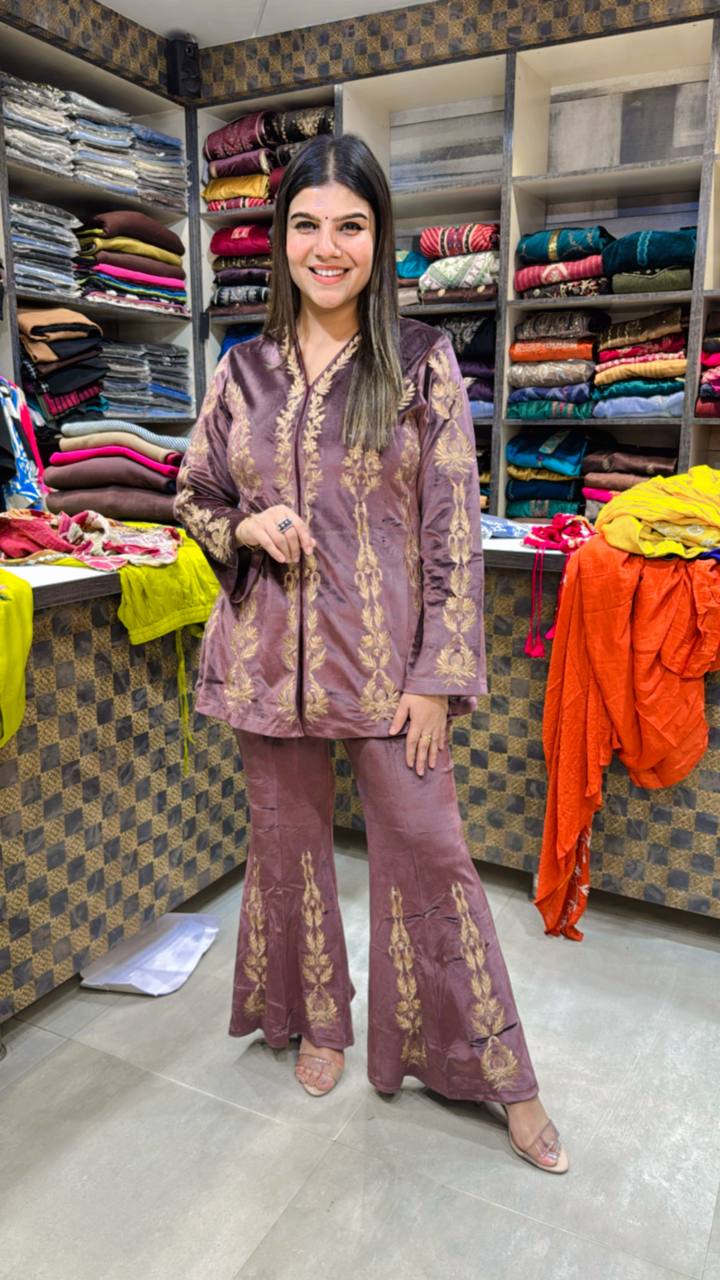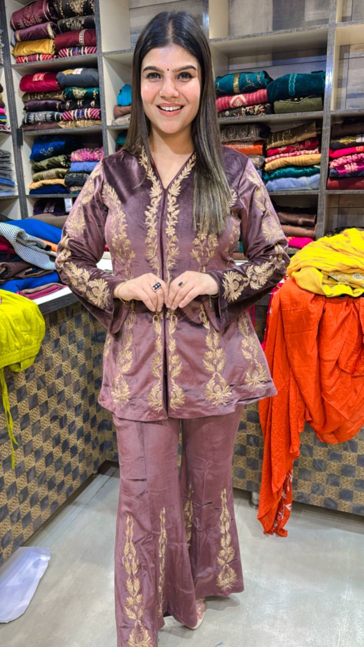 A luxurious 2-piece velvet co-ord set in a rich dusty orchid / mauve shade, adorned with antique gold zari-style embroidery. The long shirt features elegant vertical motifs that create a regal fall, while the matching flared pants carry corresponding embroidery for a perfectly coordinated premium festive look. Ideal for winter weddings, receptions, or classy festive evenings.