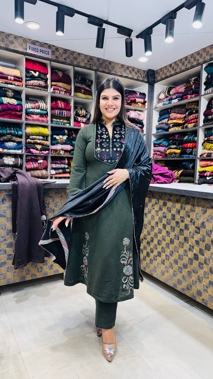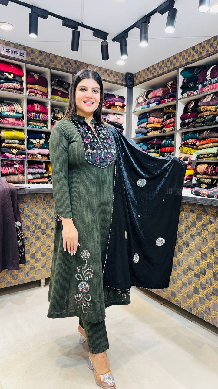 Rabwa is an elegant Premium Knitted 3-piece suit in a deep Olive Green tone, crafted for warmth, comfort, and winter style. The shirt features vertical ribbed texture with detailed multi-coloured floral embroidery on the neckline, daman, and pant hem, adding a rich handcrafted touch.